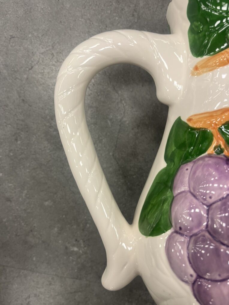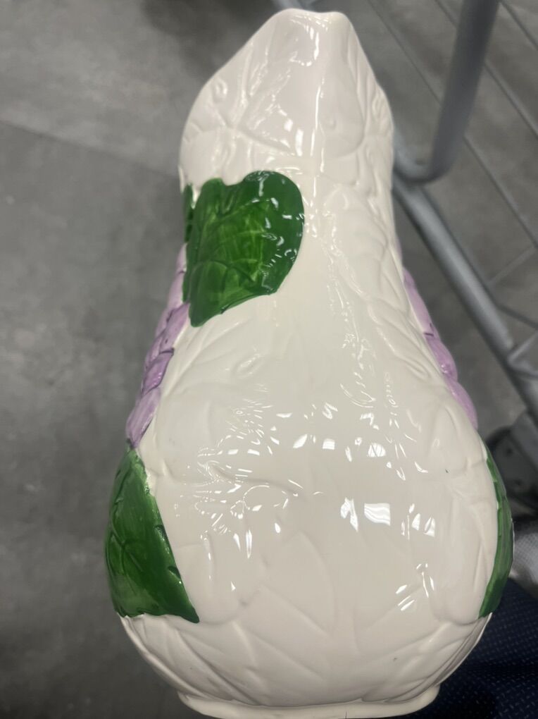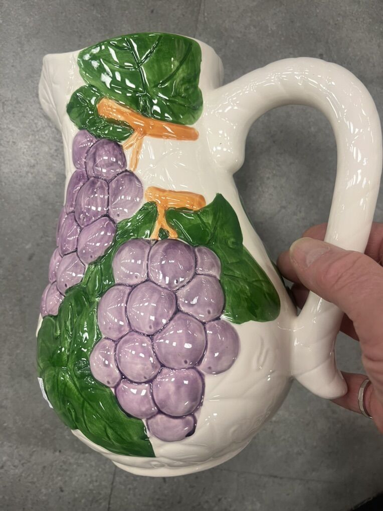 VenmoBeautiful pitcher 14” high in grapes and vines white green and purple. Beautiful decor