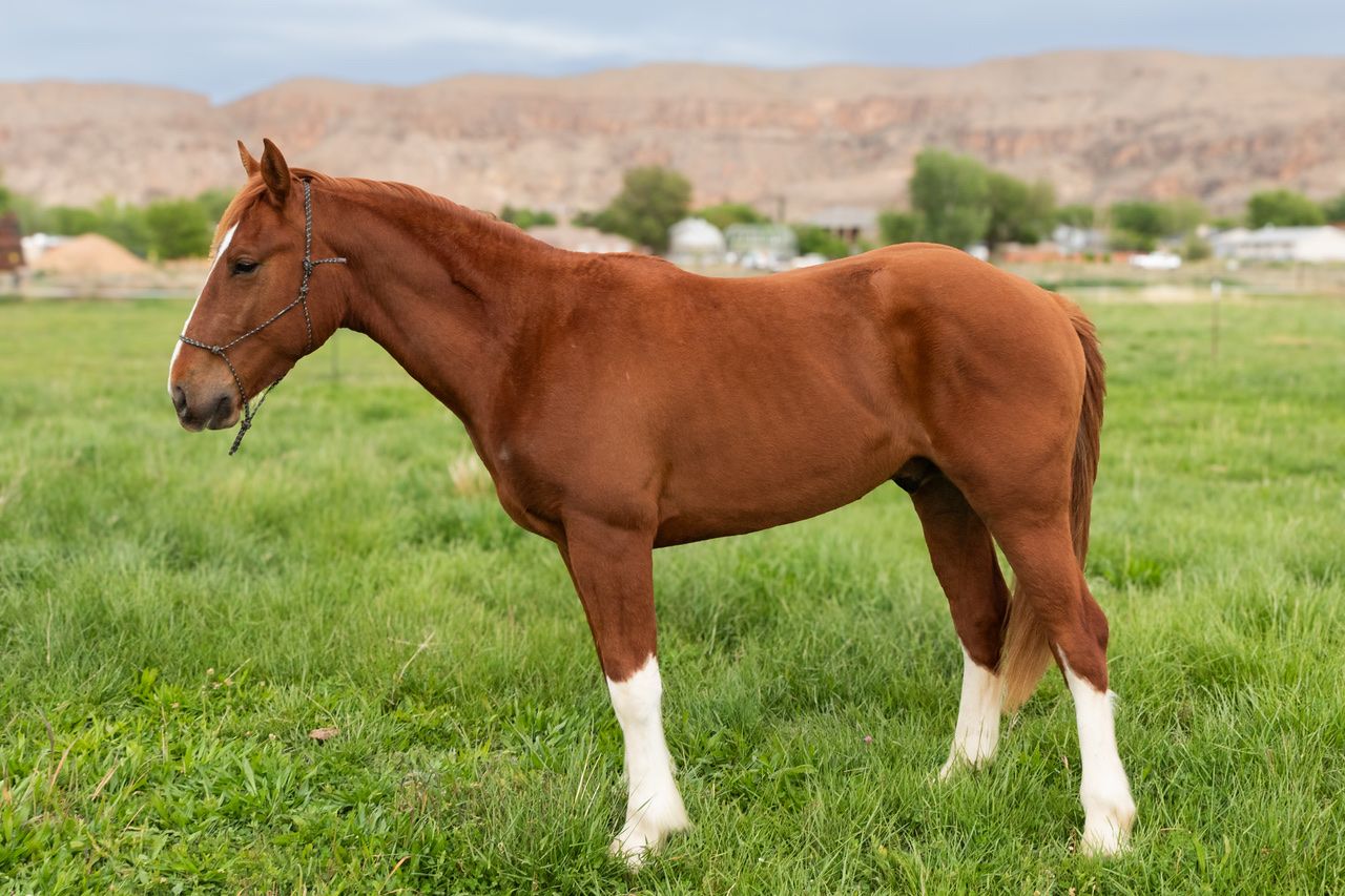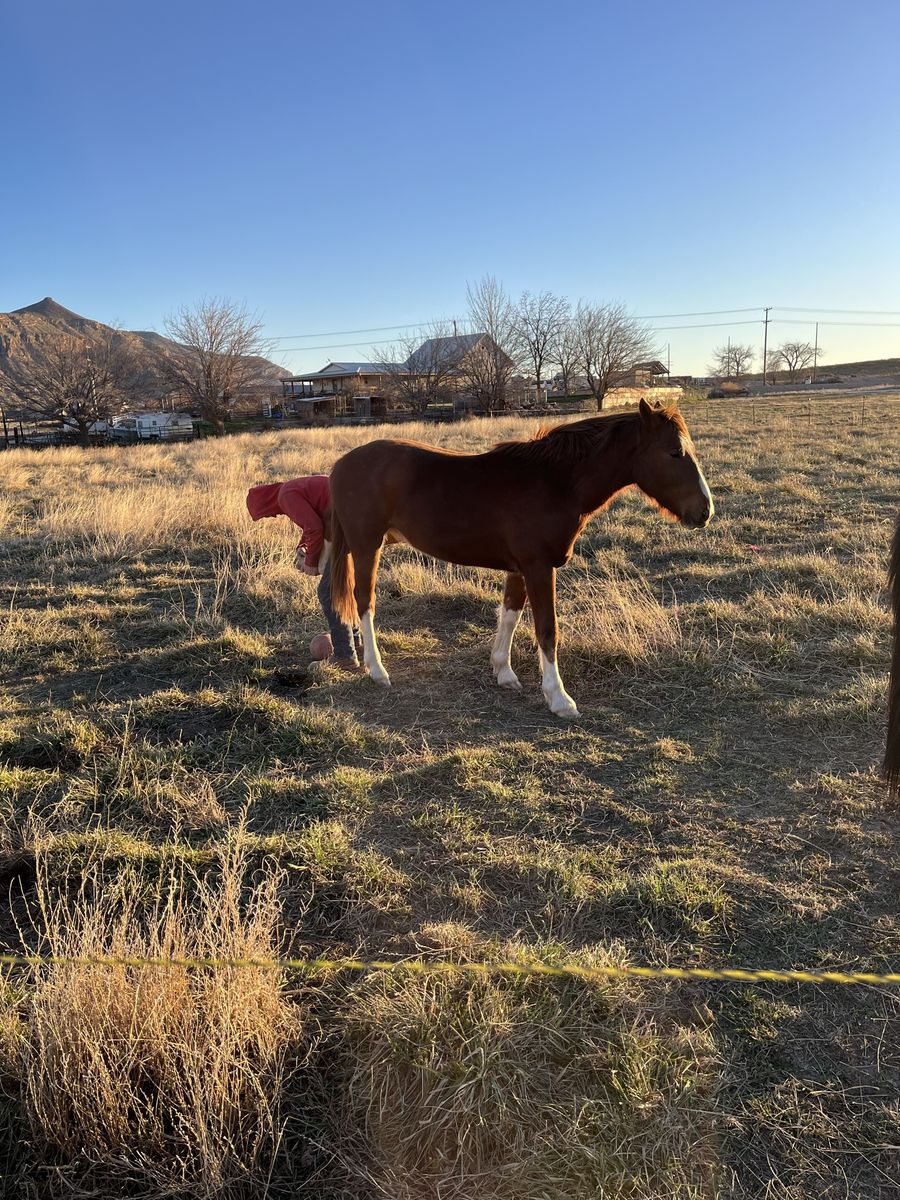 Great ground manners—stands for farrier (even loose in the field), trailers well, no kicking history, and easy to catch. Calm disposition carries over even around mares.