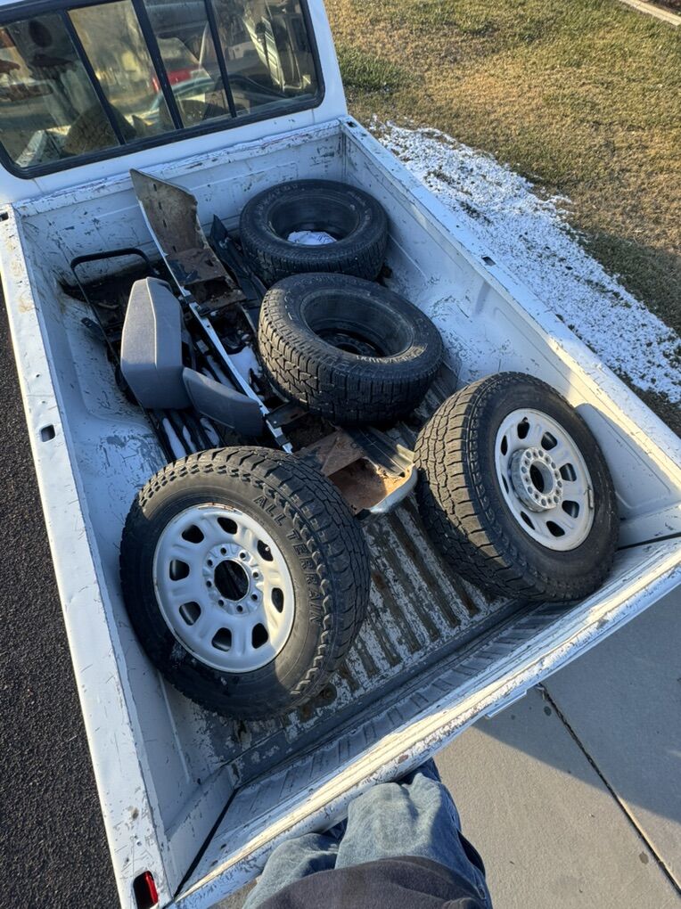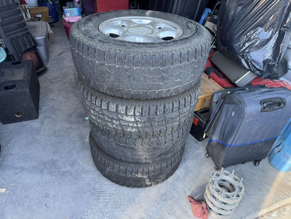 1st set 33/12.50R18 mud tires $100 2nd set 265/70R17 tires on 6 lug gmc wheels $100 3rd set 5 spoke Chevy wheels 8x180 lug pattern $100 4th set 275/65R18 all terrain tires on steel Chevy wheels 8x180 lug pattern $200 I have some lug nuts as well
