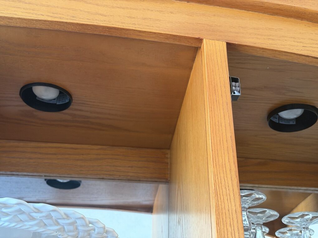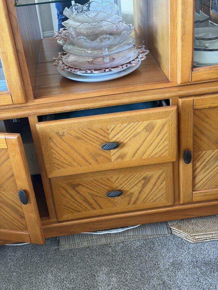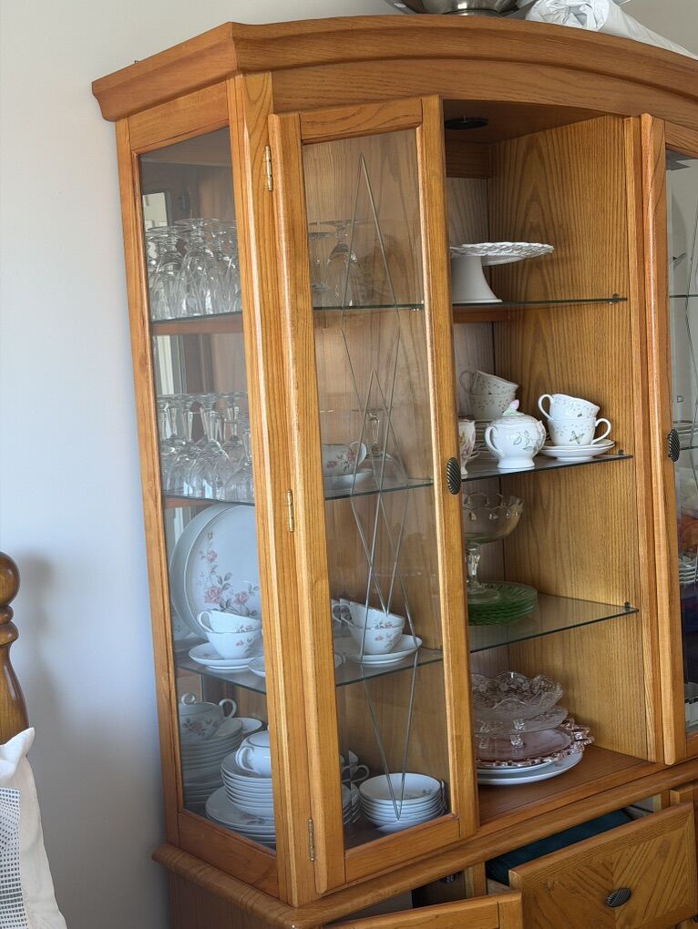 Oak China cabinet with glass shelves, mirror backing, cupboards and lighting. Measures 48”W X 79”H X 16”D I have never used the lighting and pretty sure it works. There is a hairline crack at the bottom of the lowest mirror backing, but not noticeable. This cabinet has served us well for many years. Must be able to move without help.