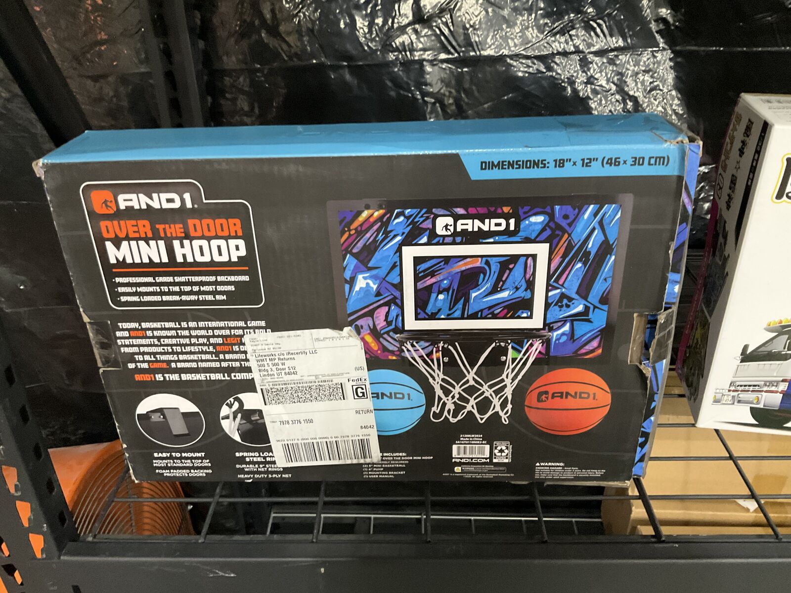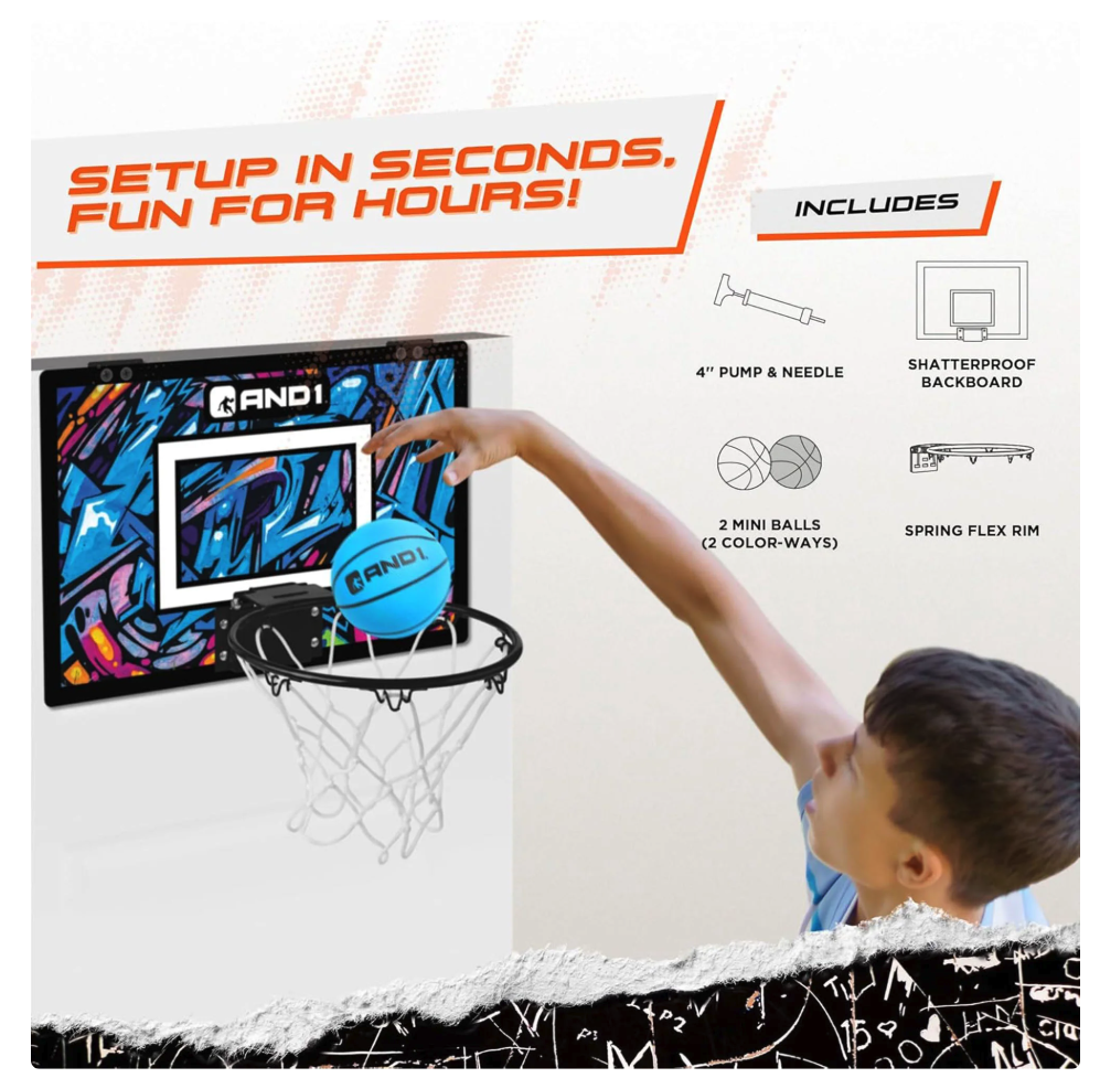 Over the door mini basketball hoop for indoor fun at home or in the office. Includes two colorful 5-inch mini basketballs and a hand pump to start playing right away. Features a 9-inch spring-loaded break-away steel rim with a durable net and an 18" x 12" shatterproof backboard with foam padding to help protect doors. Pre-assembled and easily mounts on most doors with no tools required. Great for kids and adults.