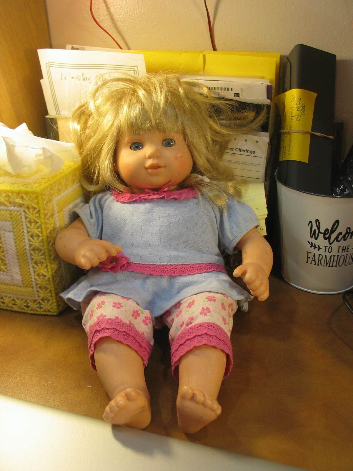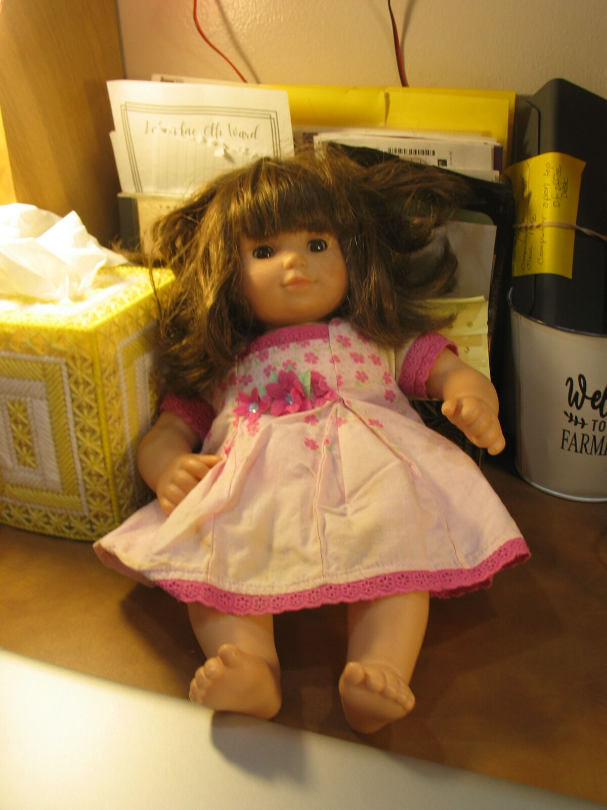 Vinyl head and sleep eye with lashes working fine and clear. Cloth body and vinyl limbs with scuff marks but for the price in fair condition. Wig is thick and beautiful needs a comb out . Cash only. No venmo . Pick up only. As-Is condition is fair
