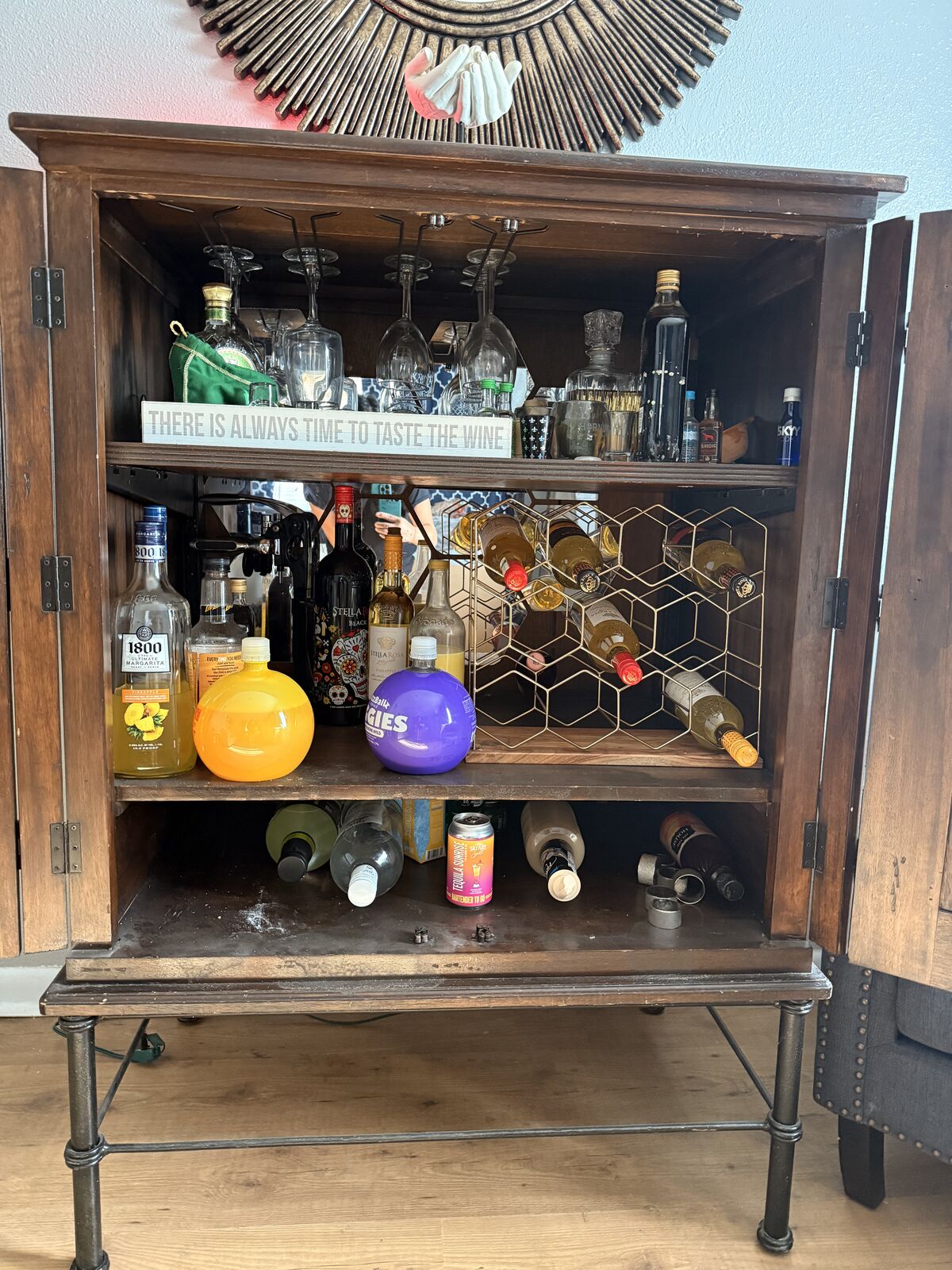 ZelleBeautiful Pier 1 Imports furnitur. Solid wood. Entertainment center converted to a wine holder and alcohol cupboar. Moving, obo