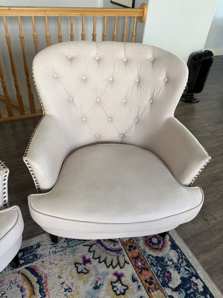 Two cream matching arm chairs with tufted backs. Needs a little spot cleaning. No smoking, no pets in home.