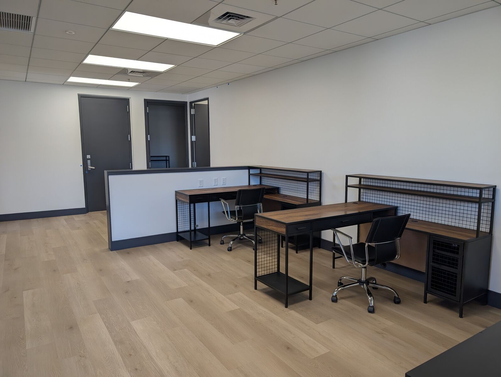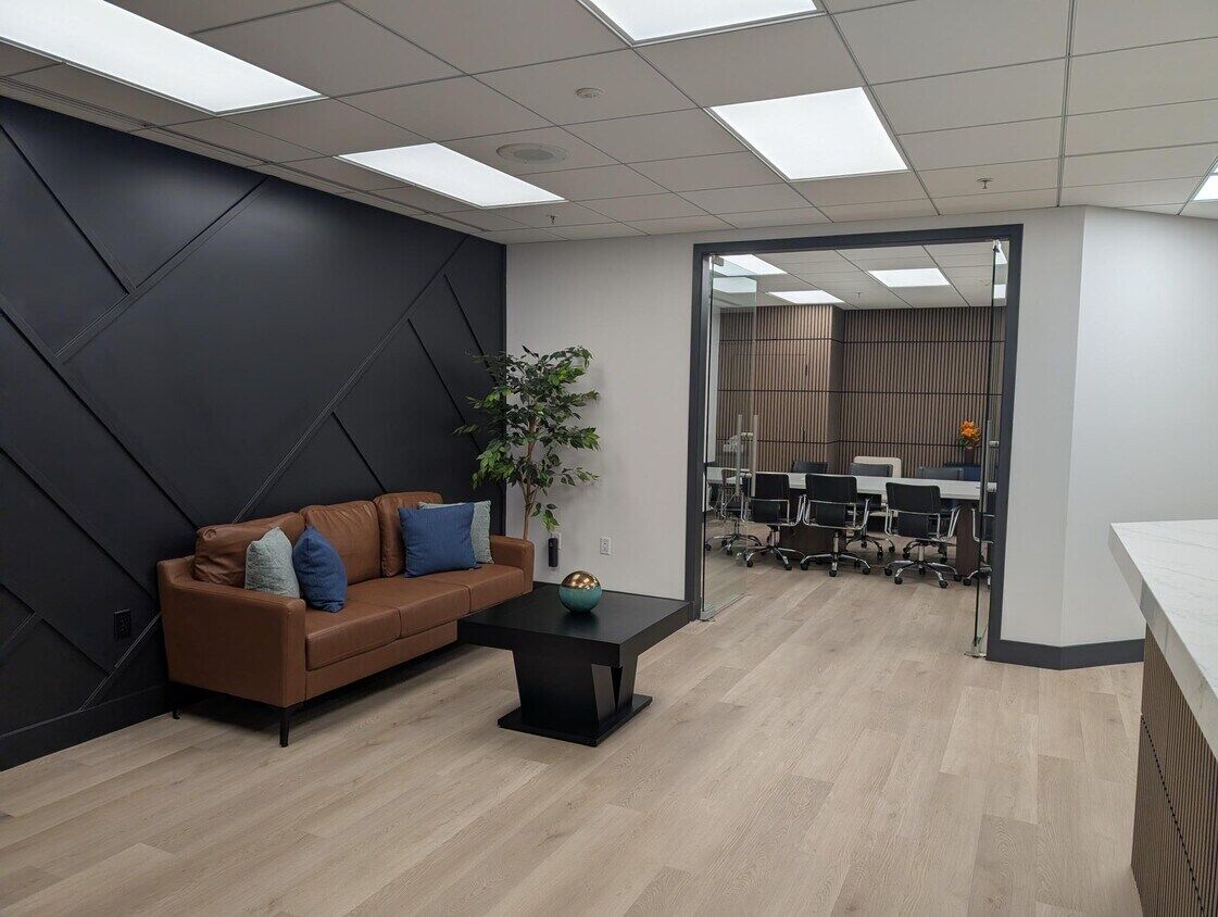 Modern, move-in-ready office suite featuring four private offices, an open bullpen area, and a welcoming entry space. The suite offers access to a shared conference room, lobby, and reception area, all fully renovated with sleek, contemporary fixtures and finishes.