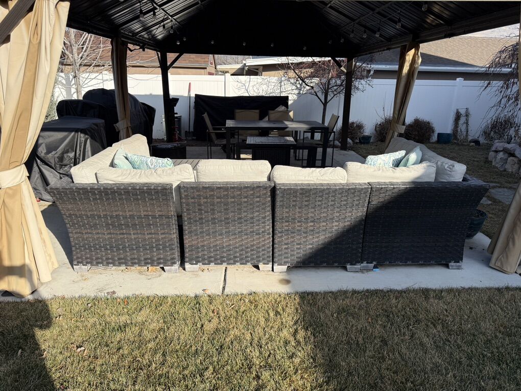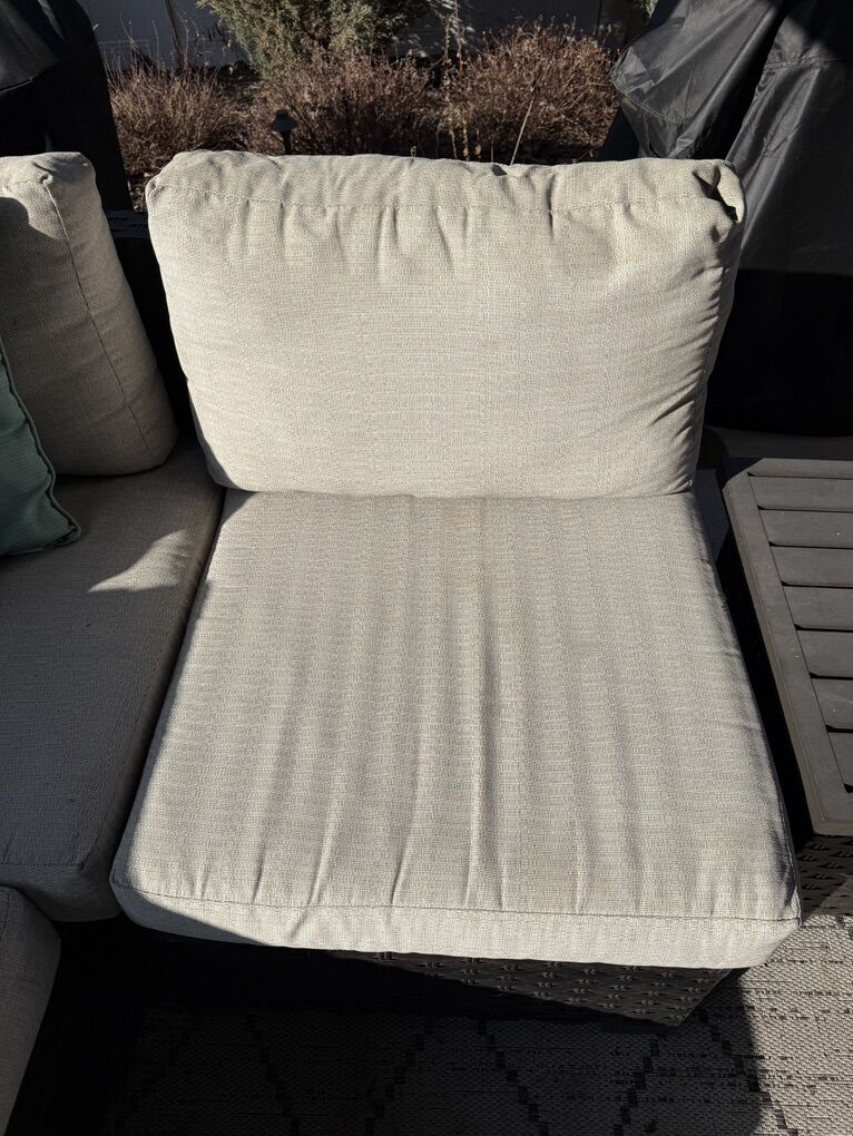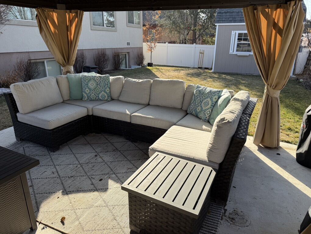 ApplePaySpacious outdoor wicker sectional with beige cushions and matching side tables. Modular design allows multiple layouts. Comfortable, sturdy, and perfect for a patio, gazebo, or backyard entertaining space. Stored under a covered patio. Normal wear from use, needs cleaning, but still in great shape.