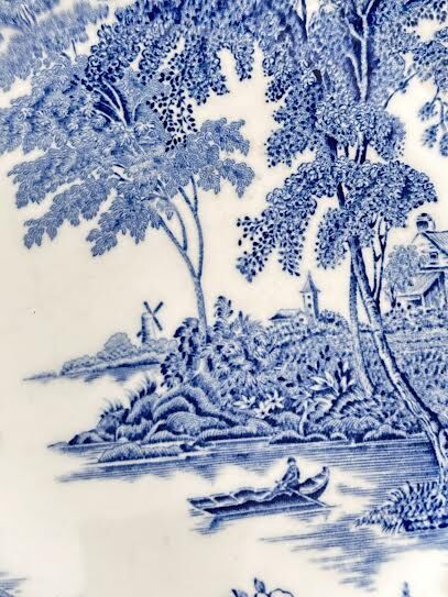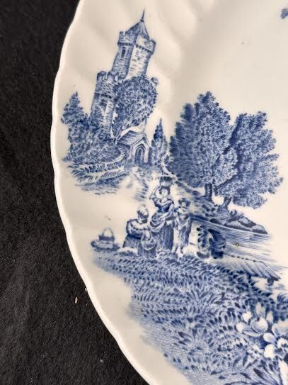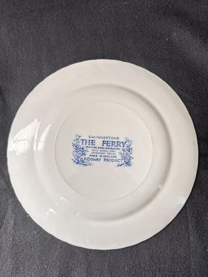 VenmoSwinnertons “The Ferry” English transferware plate. 10”. Blue on white glossy finish. Scalloped rim with fluted 1.5” border. Scene depicts ferry boat crossing river to where three women await the ferryman. A quaint cottage is settled on the hillside with a farm and windmill in the distance. Roses and flowers decorate the plate bottom. Note attention to detail. Genuine hand engraving. Made in England. A Ridgway product.