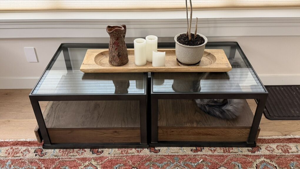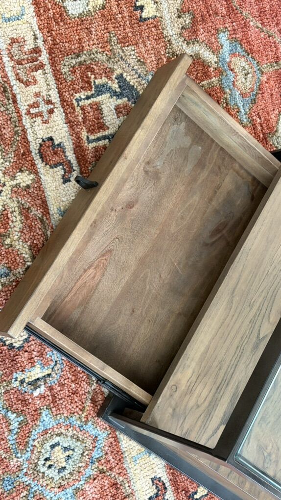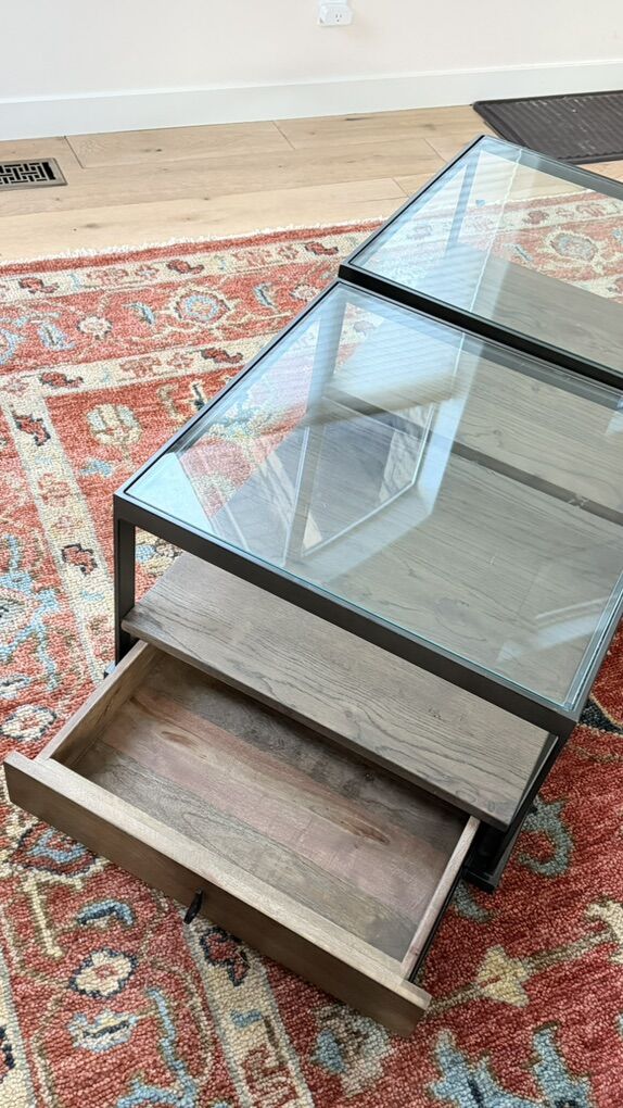 VenmoBeautiful, well-made solid wood tables with metal framing and glass tops. These have been used together as a coffee table, but they are modular and can easily be separated and used as two matching end tables.