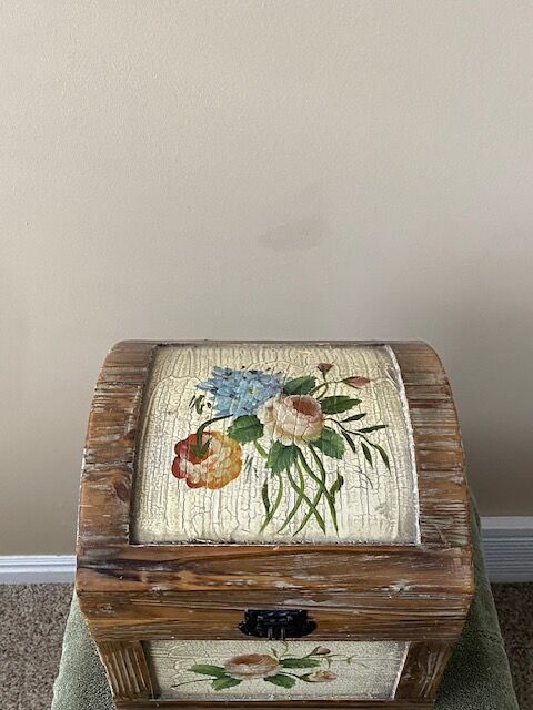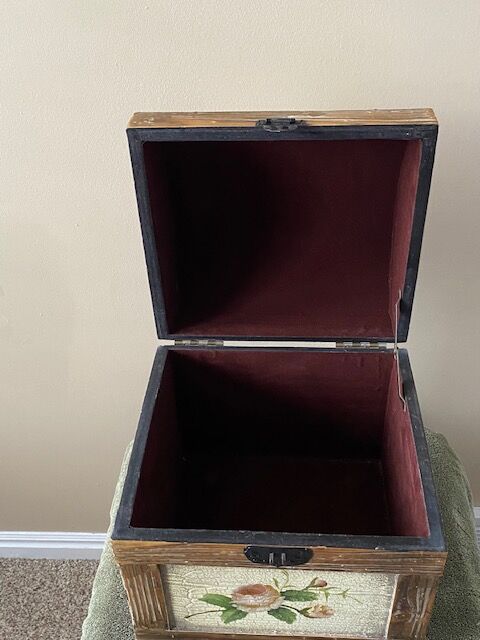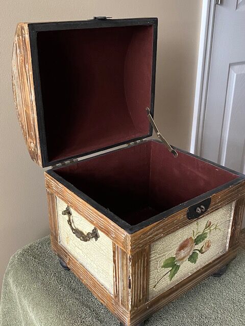 Vintage collectible camel-back, velvet-lined wooden trunk.