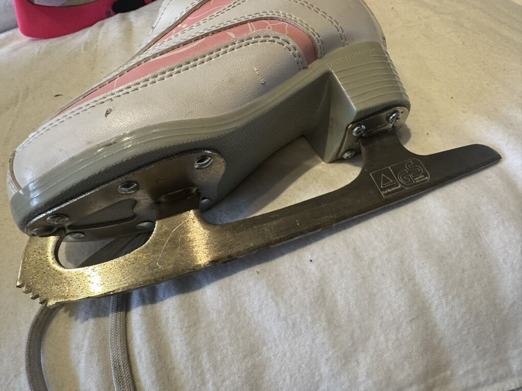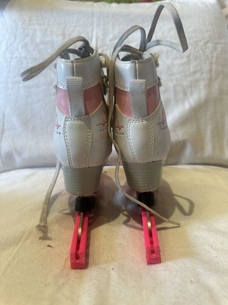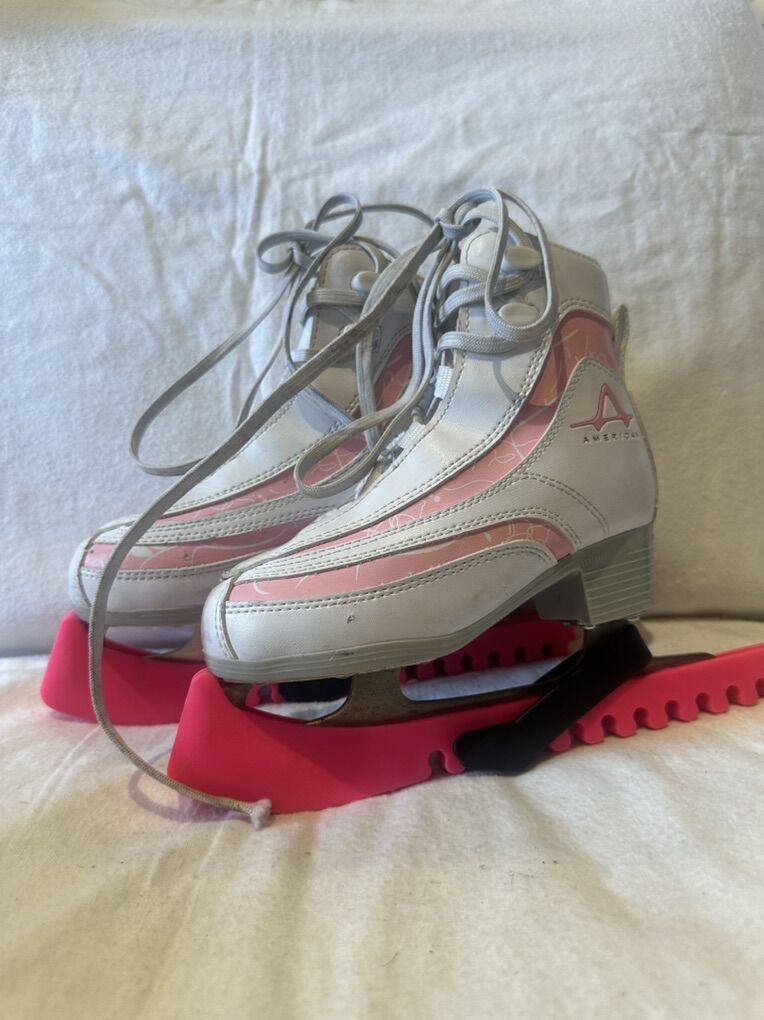 American toddler size 12 white figure skates with pink accents and hot pink blade covers. These are in good condition, see photos for details. I take cash or Venmo, but cash is preferred. Text is best. 8012014446. Check out my other ads for additional sizes and styles.