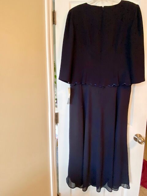 Woman’s formal full-length dress, never worn. One-piece with back zipper, size 14, navy, ¾ sleeves