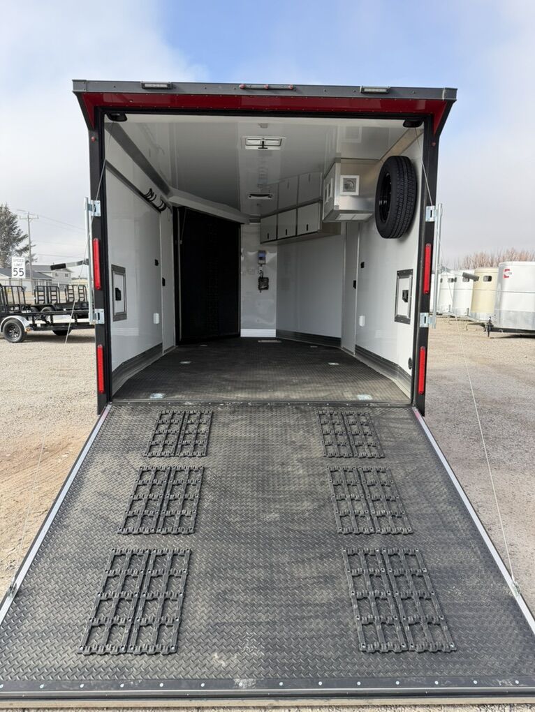 12' Box + 6' V-Nose Rubber Diamondplate Floor (Added to Both Ramps) Furnace White Luan Interior 3,500lbs Torsion Axles Spare Tire and Mount Black-out Trim Spoiler 14x14 Roof Vent Extra Marker Lights Recessed Battery Box (2)15x15 Fuel Doors Cable Assist Ramp 15AMP 110V Interior Receptical MP5 Package(12V Battery,40k Forced Air Furnace, 6' Helmet Cabinet, 8' Clothes Rack) 15AMP Convertor Package(15 AMP Motorbase, Service Panel, Breaker, Outlet, Power Supply) Interior Race Package(.030 Aluminum walls and Ceiling, Interior Roof Covering, 6 Skid Plate, Rubber DP Floor Covering)
