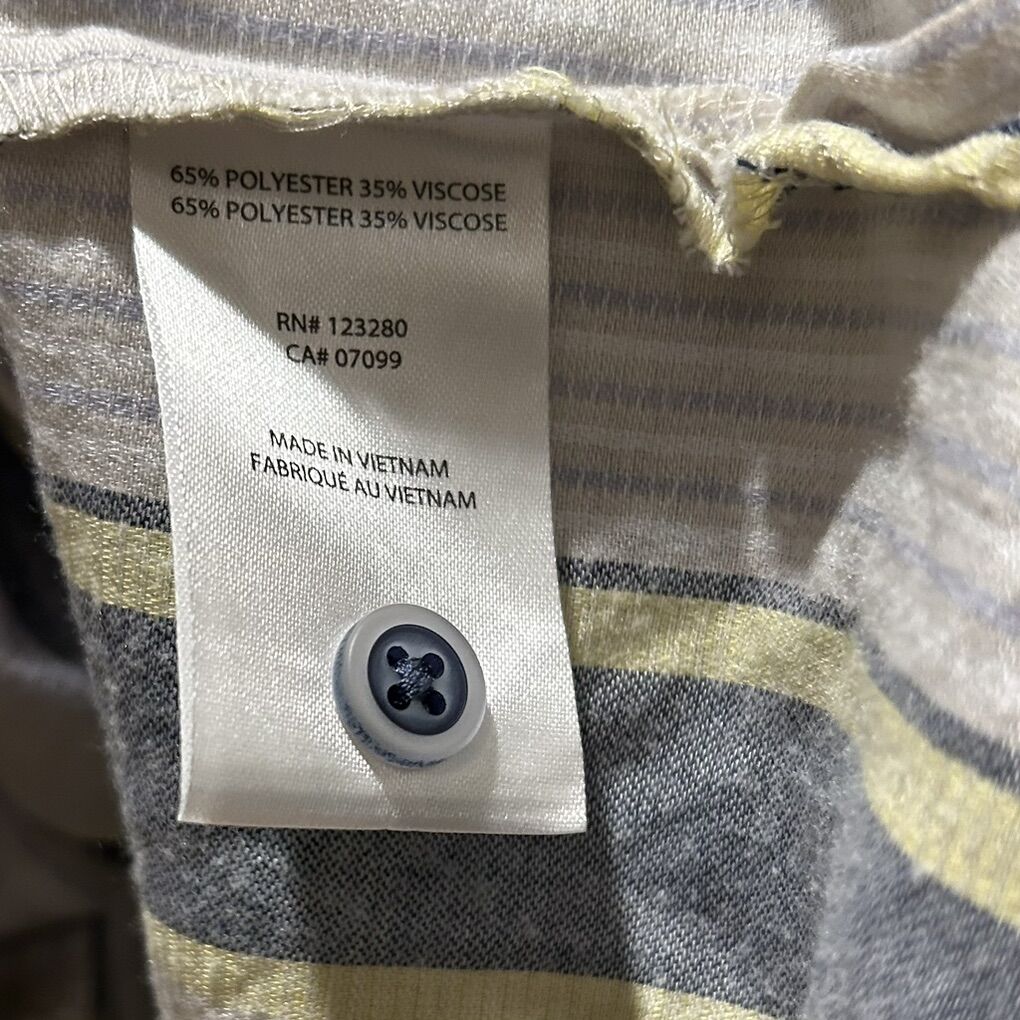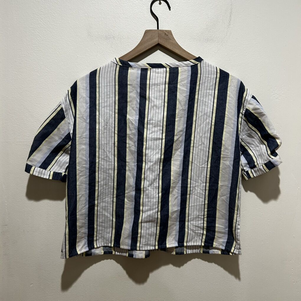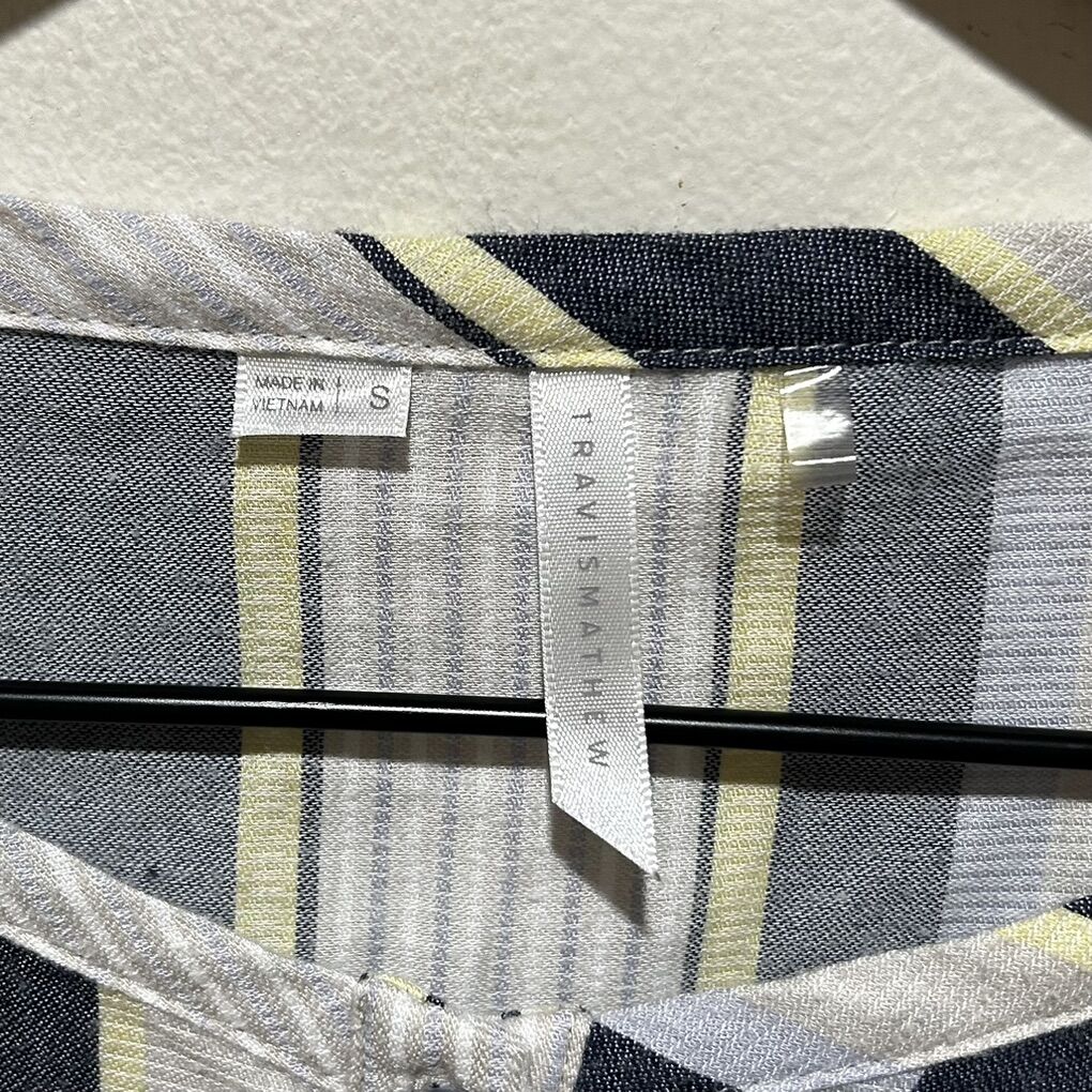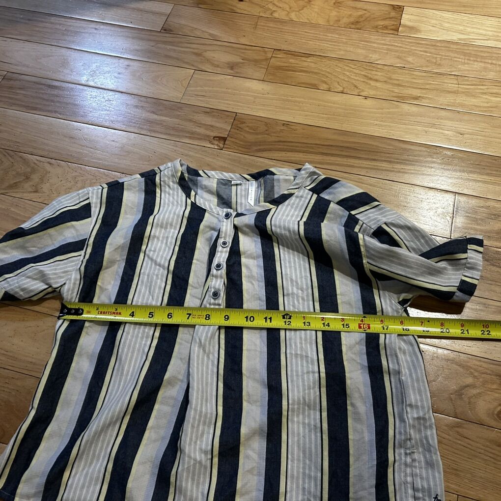 Travis Mathew Blue, Yellow and Beige Stripes Babydoll Flowy Lightweight Blouse Shirt - Women’s Size Small - with half button front and short puffy sleeves - good condition - pre-owned.