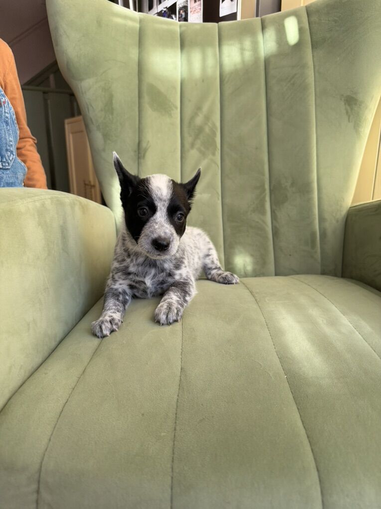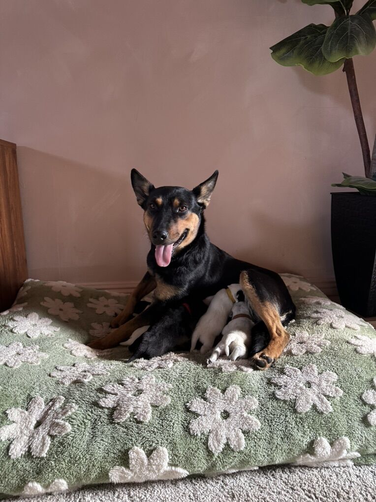 My foster momma and her blue heeler puppies are ready for adoption! Momma is a Kelpie dad is a blue heeler.