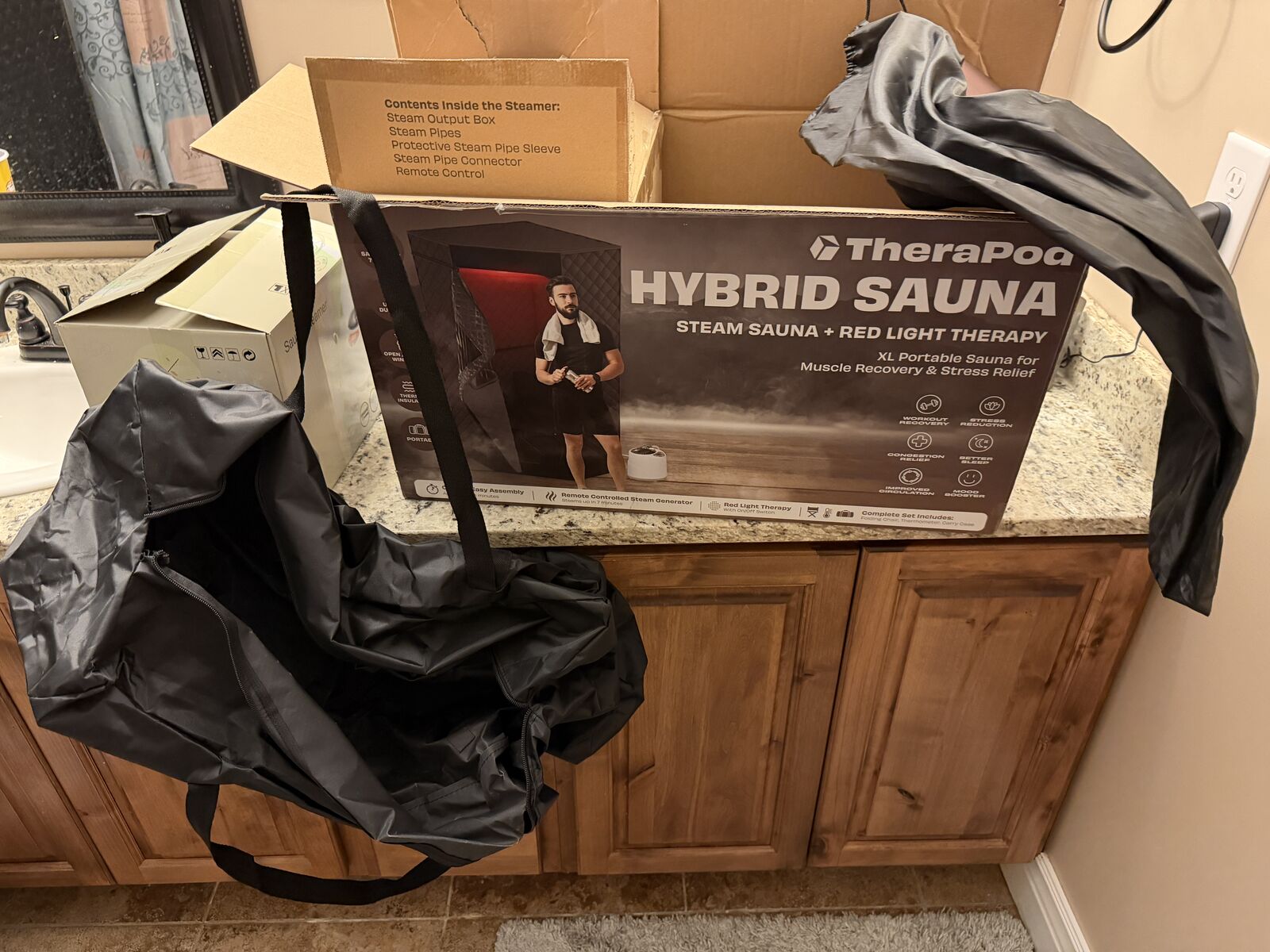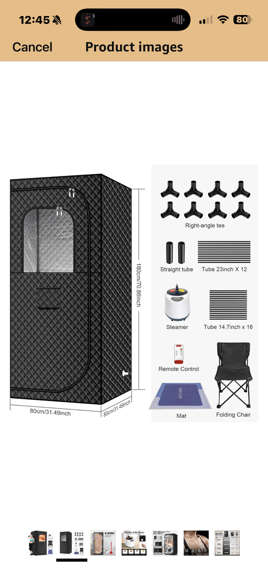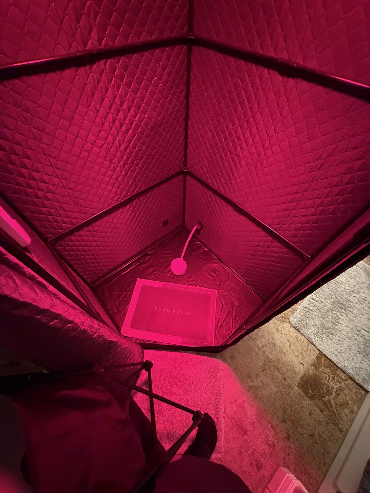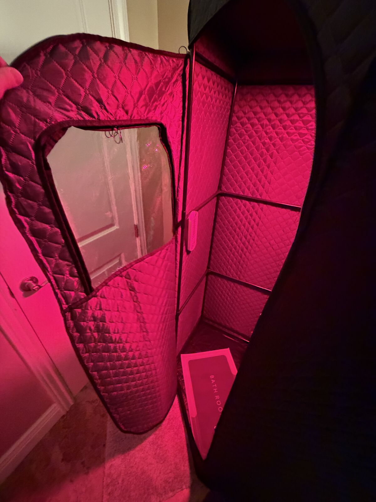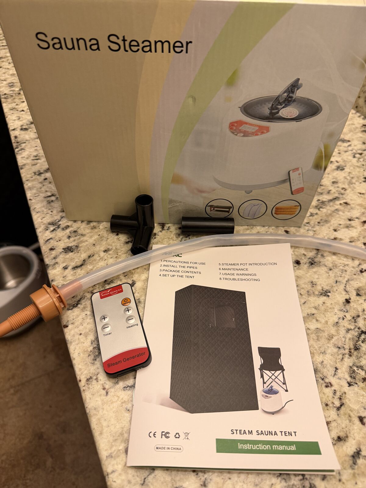 (copied from the web) -Benefits Of Sauna: Elevate your training with the restorative benefits of steam. Indulge in the rejuvenating power of steam and experience a multitude of health benefits. Releases dynorphins and endorphins to improve mood, relieve stress, reduce cortisol levels and relieve body aches, improve body function and promote health, detoxification, improved circulation, a boosted immune system, and reduced stress levels. -Extra Large Size & Convenient Design: We've enlarged the internal space, the oversized (2.6’ x 2.6’ x 5.9’) steam tent is suitable for adults of different sizes. There is a pocket inside that can be used to store mobile phones and other small items.It also equipped with a waterproof folding chair,allowing you to enjoy the sauna more comfortably. The zippered transparent window allows you to stick your head out for air at any time,and you can open it when you need to use mobile phone or read a book. -Faster Heating Speed: The portable sauna steamer has a power of 1500 W±10%,2.6L water capacity, and 9 heating levels; which can fill the entire steam tent in a short time. High-power steamer that can generate steam faster and shorten the preheating time; Steamer has a 1-60 minute timer with the remote control, you can adjust the heating level and time according to your needs, let you enjoy a convenient and comfortable sauna experience. -Integrated Infrared & Red Light Function: This infrared sauna includes a built-in red light panel with 660nm and 850nm wavelengths, positioned at the top of the tent for even light coverage. The red light sauna function can be adjusted independently to match different comfort preferences. -Easy to Install: Crafted with premium materials, our full-size steam sauna is designed to withstand the rigors of frequent use. Consists of a detachable frame, it have two lengths, the longer Fiberglass Tube is 23.11 inches,and the shorter 14.76 inches. The detachable frame allows for quick assembly and disassembly, while the structure ensures durability and longevity. Its durable construction ensures long-lasting performance and years of enjoyment. Enjoy the flexibility of a sauna anytime, anywhere. -ACCESSORIES INCLUDED: The folding sauna comes with everything you need to elevate your relaxation and rejuvenation. Included in the kit are a sauna tent with poles, 2.6L steamer, chair, remote control, floor mat, carrying bags. With added Red light therapy light.