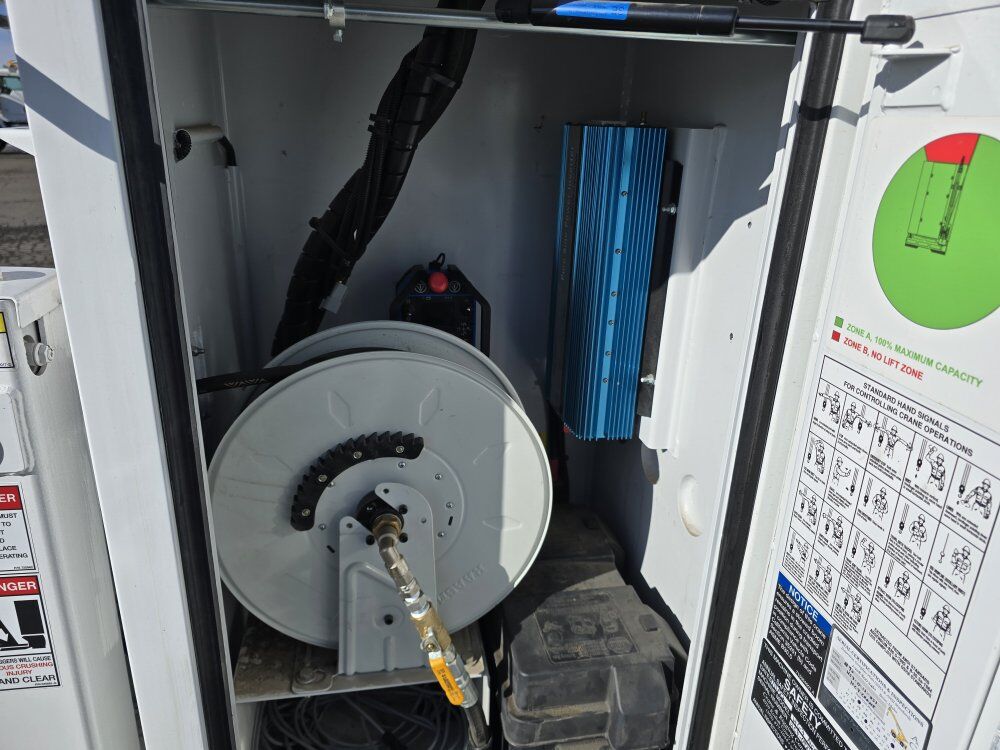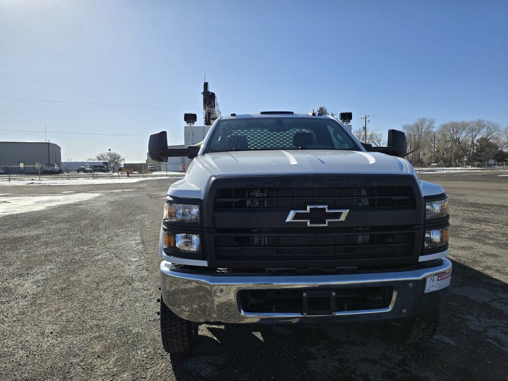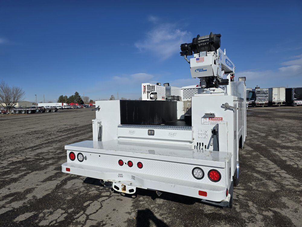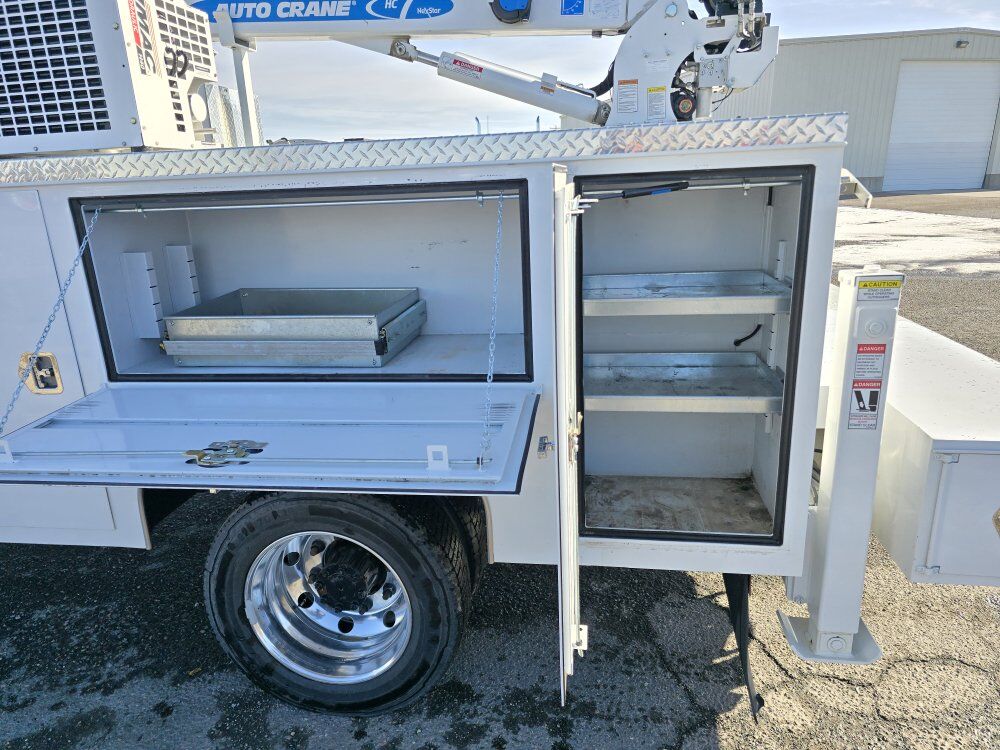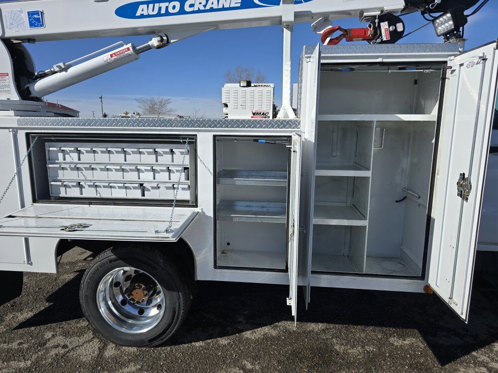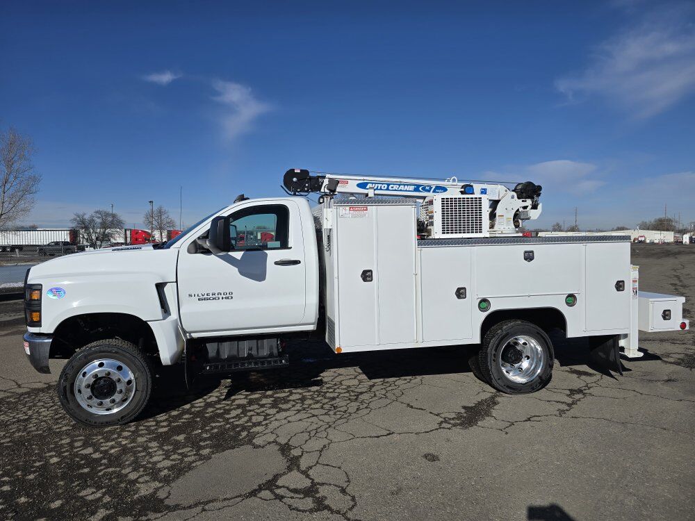 2022 Chevy Silverado 6500HD mechanic's service truck, 350 horsepower Duramax diesel engine, Allison automatic transmission, four wheel drive, 11,000 miles, 23,000GVW, exhaust brake, backup camera, Bluetooth, power windows locks and mirrors. SELZI service body, Autocrane HC-7 hydraulic 7,000 pound 20 foot 6 inch reach crane, two hydraulic outriggers, wireless remote, Vmac 40cfm hydraulic air compressor with 7 hours, one drawer pack, good tires, former municipal truck 208-734-3434