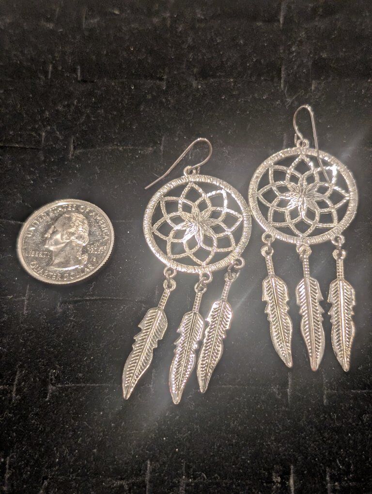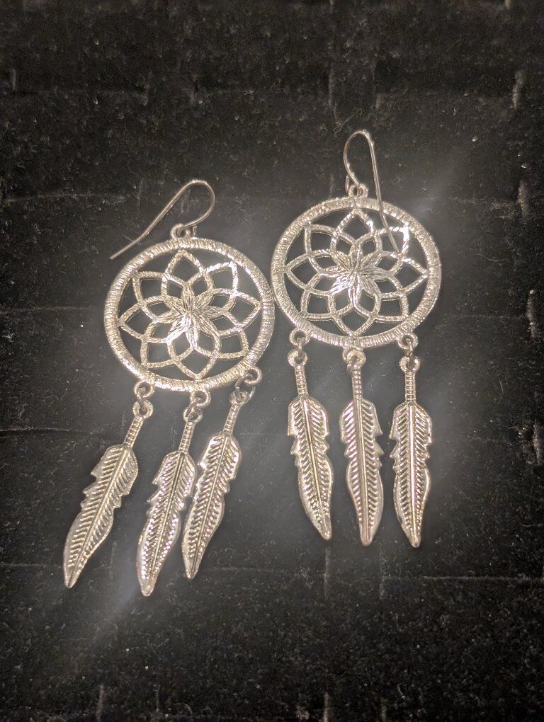 Lightweight silver-tone dreamcatcher earrings with floral web design and triple feather drops. Great movement, clean shine, easy everyday boho.