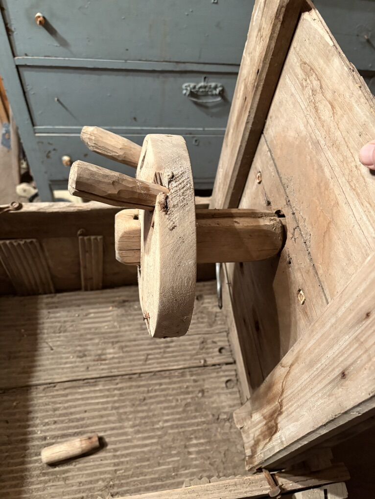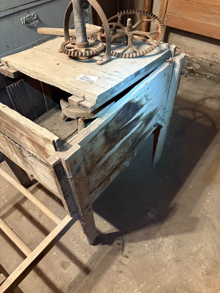 This full-size version was likely manufactured by the Benbow Manufacturing Co. in St. Louis, Missouri. The design has a patent date of December 3, 1895. It features a wooden tub with an interior agitator turned by the hand crank and cast iron gears. There are a couple broken pieces of wood and a missing bracket to hold the hand lever.