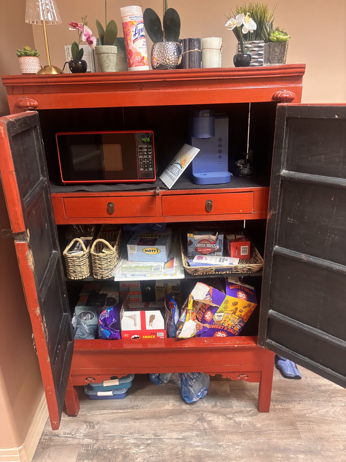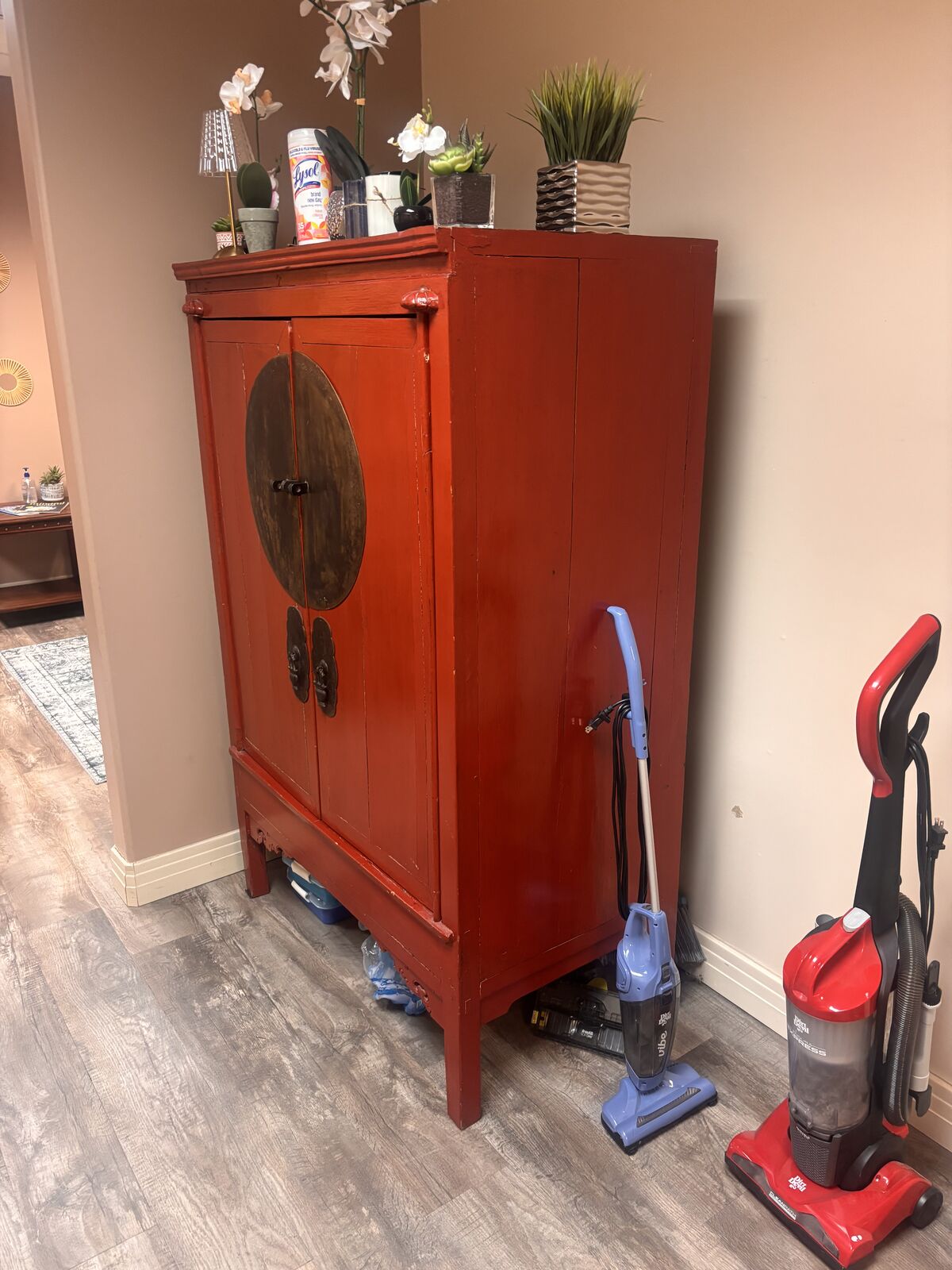 ApplePayBeautiful red armoire cabinet with original brass mood hardware. Solid wood with shelves and drawers inside. Great for a bar cabinet, pantry, accent storage piece, or your own DIY project! In great condition. Down sizing at our office, our loss your gain! $175.