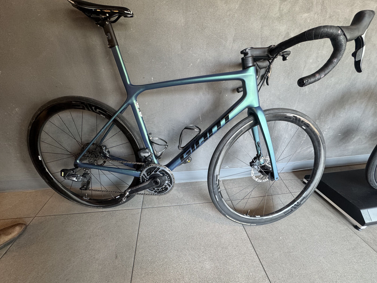 Sizs ML (I think about 56) on Giants most High end frame. I can't rember how much it weighed when we built it but it was crazy light. Sram red cranks, Force shifters, power meter. I am 6'1" and I didn't have to cut the seat post all that much. So lots of room to go up or down still. Enve ses wheels as well. Very well maintained bike. Let me know if you have any questions.