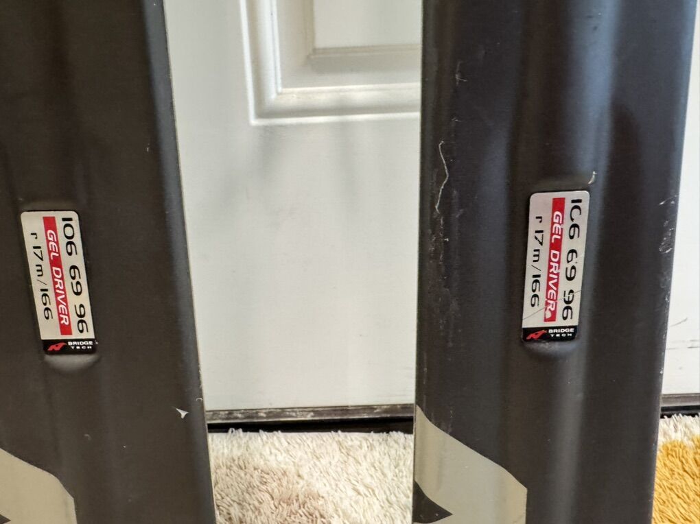 In good condition with a few scratches on the bottom and on top. Great skiis.