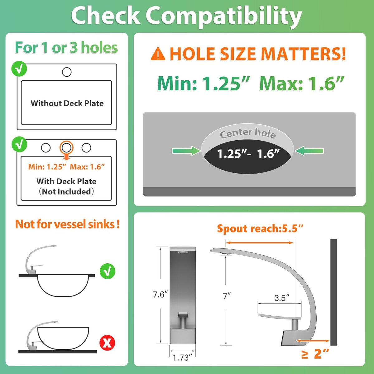 About this item - Please ensure your sink's center hole is at least 1.25" (32mm) for proper fit before purchase. This bathroom single hole faucet is designed for 1-hole sinks and can also be used on 3-hole sinks with a deck plate (not included) when the center hole meets the size requirement.