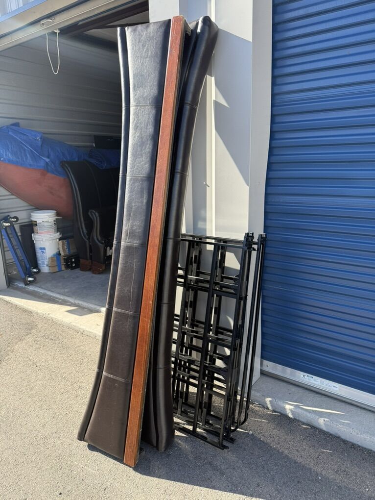 PayPalPrice Reduced As-Is leather California King sleigh bed frame and box springs ready to go. Includes headboard, side boards, footboards and mattress box springs. This is a very solid wood and leather sleigh bed with curved head and foot boards.