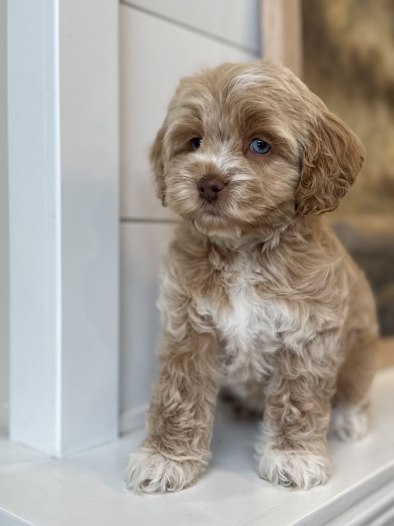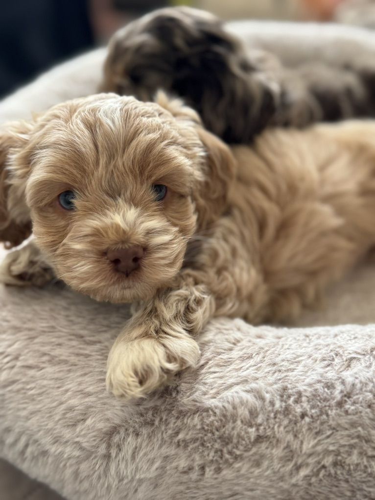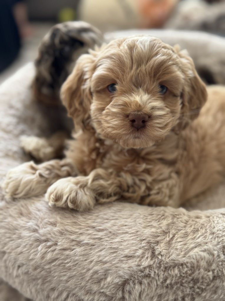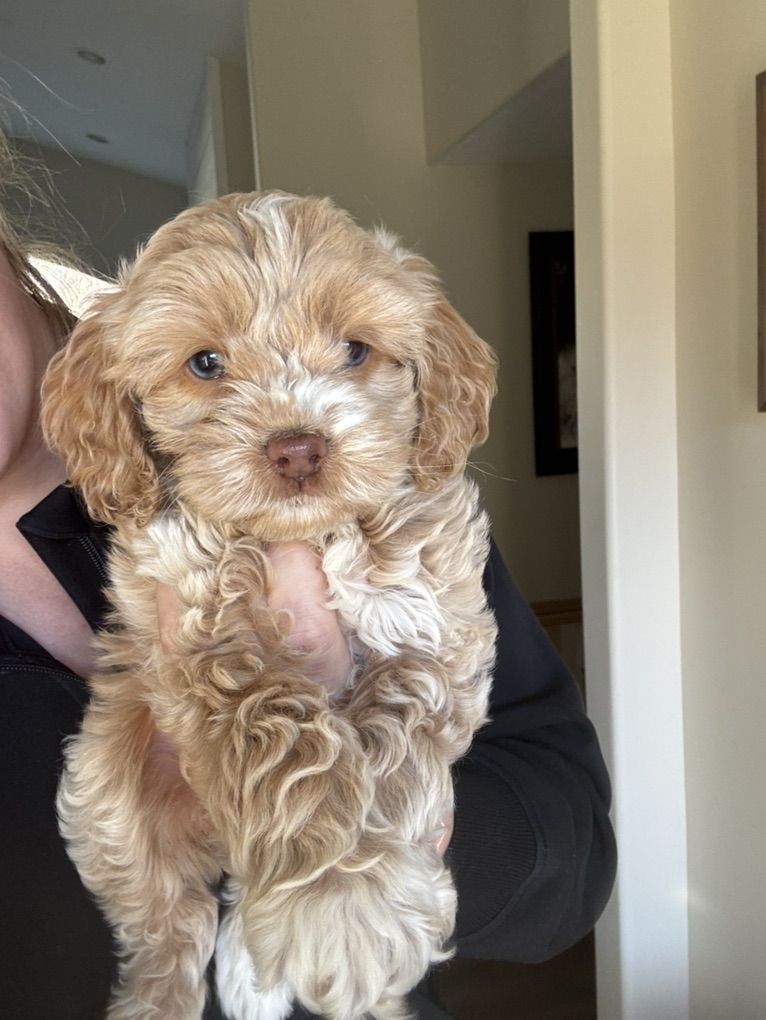Miss Cutie Pie! She is a F1 cockapoo that I expect to weigh around 20lbs. She is the perfect, middle of the road, personality! Will play yes, but also is a pro chiller. Which I love! She also has some incredible unique coloring. She got some champagne, Rosie gold coloration going on. Then her blue eyes, ooof! Beautiful girl! So excited to add this girl to our program! If you’re interested in co owning her with us pls reach out! Ready to go next weekend!