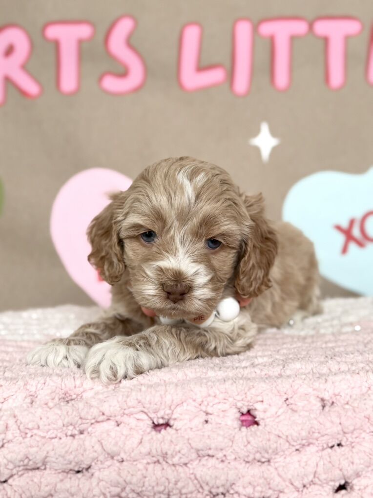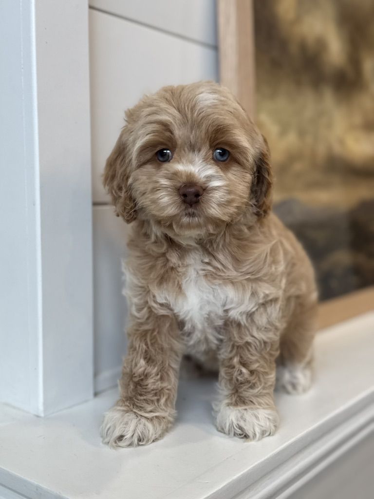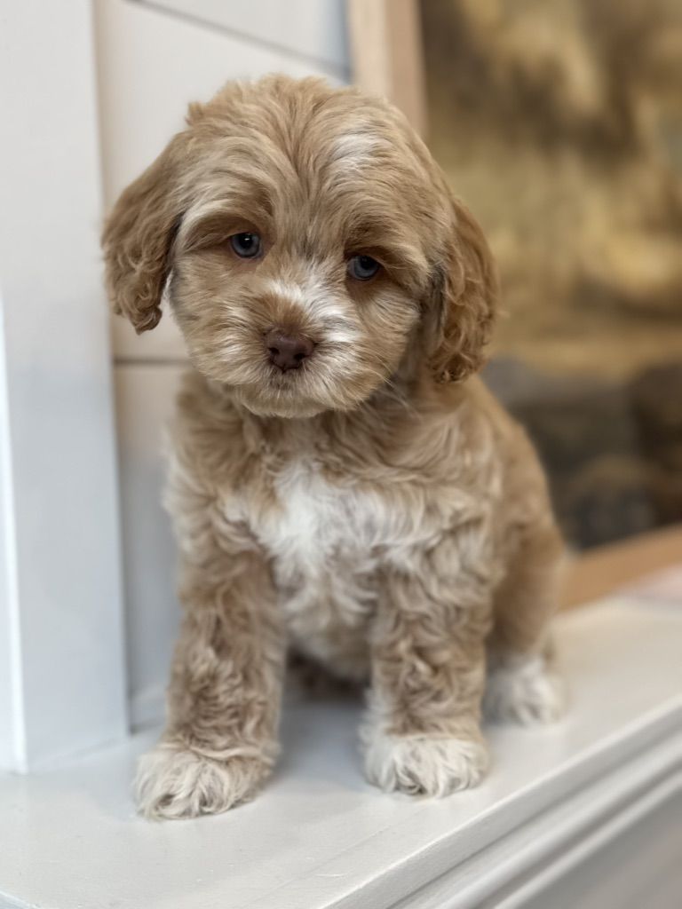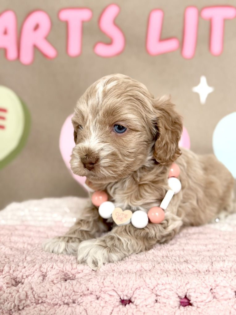 Miss Cutie Pie! She is a F1 cockapoo that I expect to weigh around 20lbs. She is the perfect, middle of the road, personality! Will play yes, but also is a pro chiller. Which I love! She also has some incredible unique coloring. She got some champagne, Rosie gold coloration going on. Then her blue eyes, ooof! Beautiful girl! So excited to add this girl to our program! If you’re interested in co owning her with us pls reach out! Ready to go next weekend!