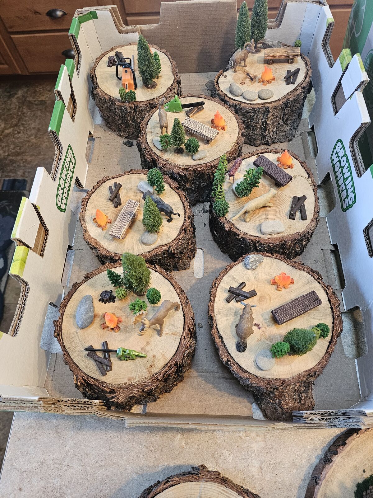 PayPalThese are crazy fun centerpieces - wildlife, campfire, benches, chainsaws, etc. miniatures on rough cut logs.