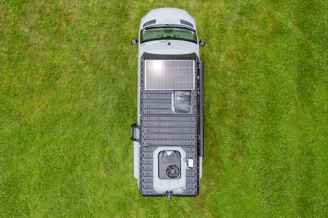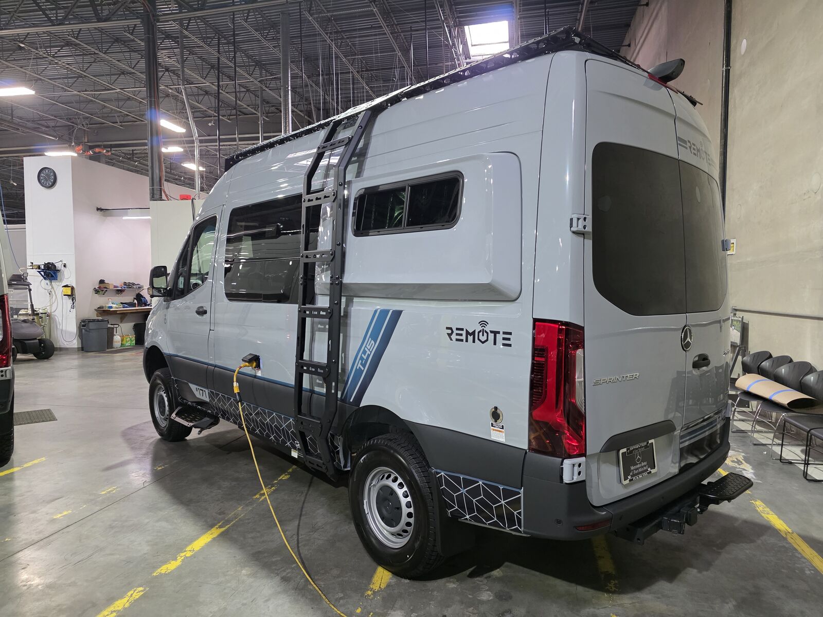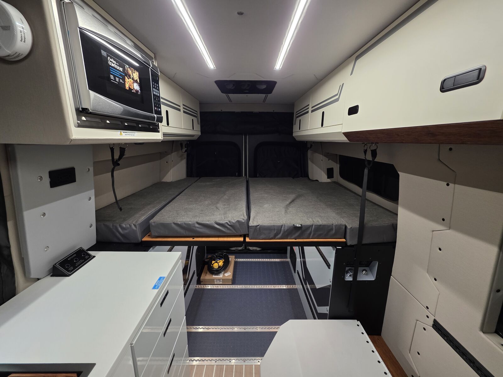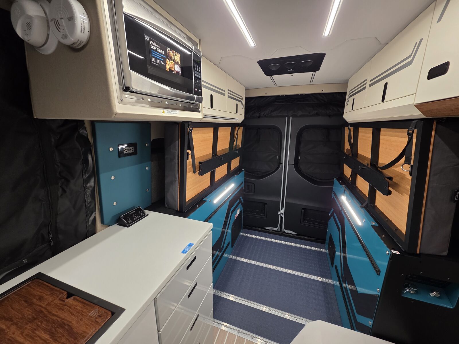 Comfortable legless queen bed and rotating seating allows sleeping for four Kitchen setup with sink, fridge/freezer, and cooktop Superior three layer insulation with Kilmat, Solarcore, and Havelock coupled with Rixen hydronic air and water heating system for true 4 season comfort Diesel heater for cold nights and 48V Nomadic cooling system for hot days Solar power with 8.4 kWh battery Interior lighting, outlets, and ventilation