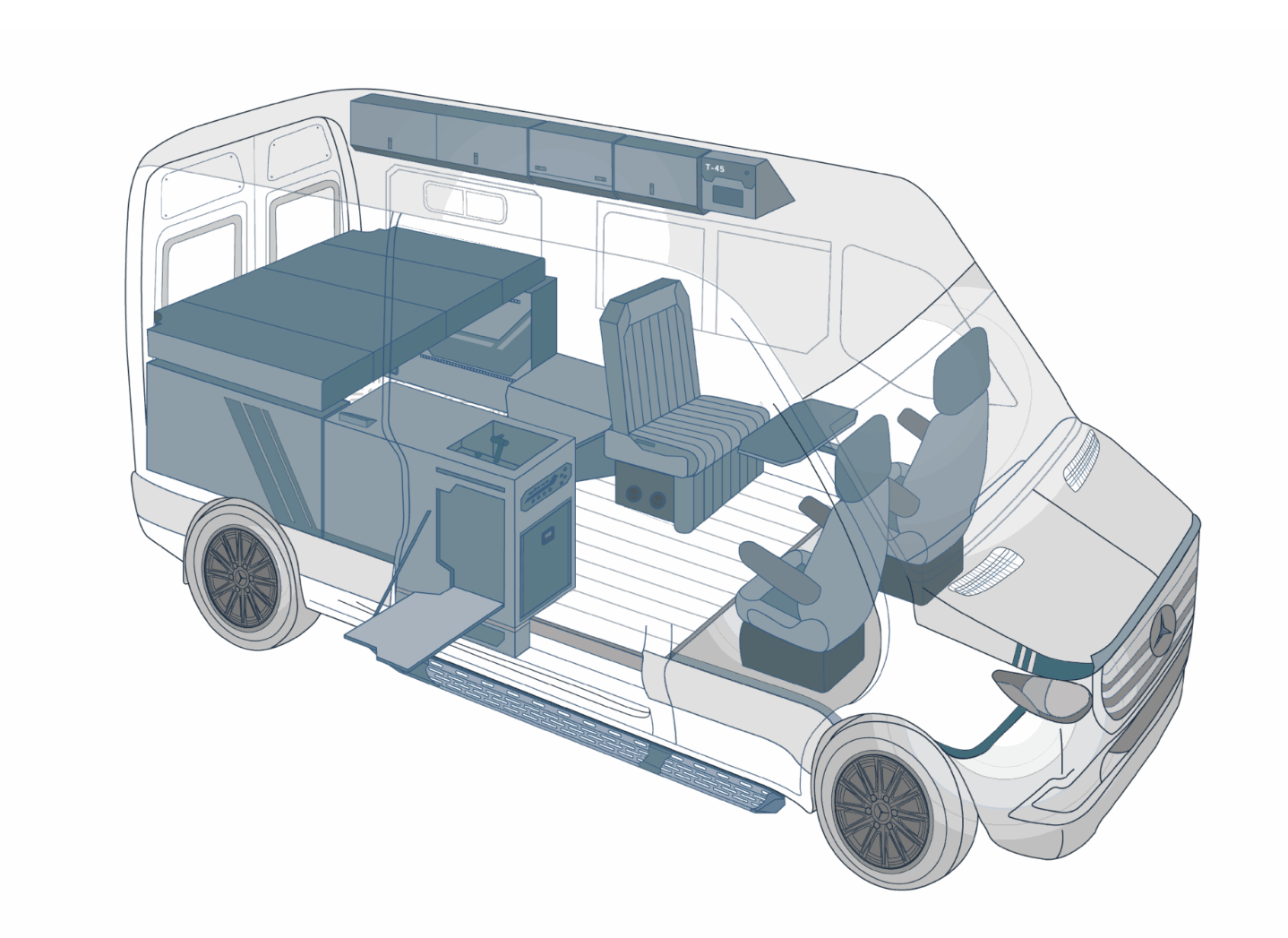 Mercedes-Benz Sprinter platform for reliability and easy maintenance. All the systems are simple, reliable systems that are easy to use. The interior is thoughtfully designed with no wasted space so you don't have to worry about skipping the essentials while you're figuring out the necessities. The current build is everything you need, but also allows for your customization so you can personalize it and make it as unique as you!
