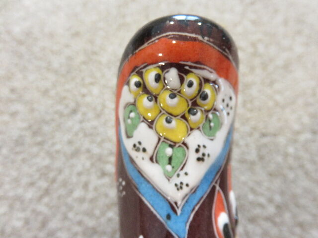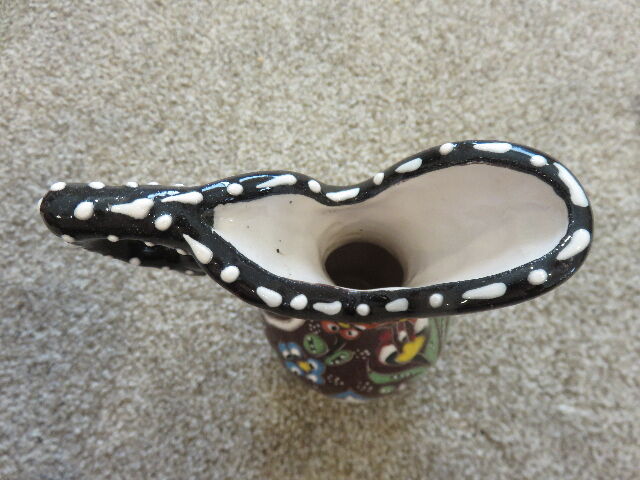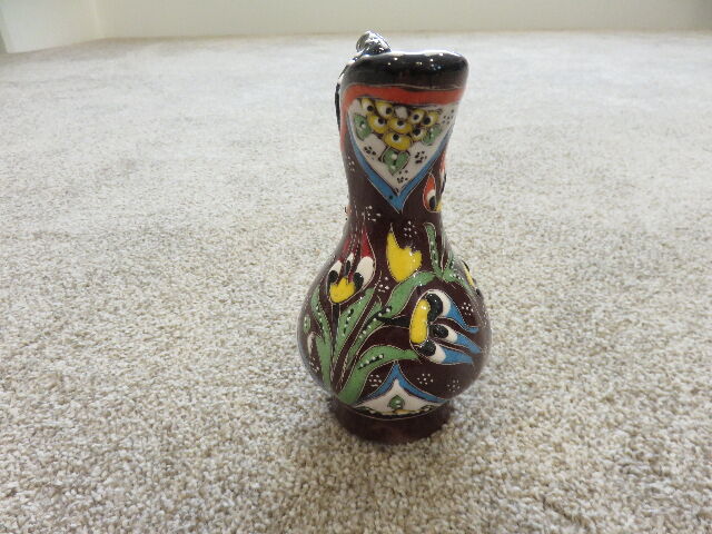As the pictures show, this vase, which measures approximately 5 1/2 inches tall and is about 3 1/2 inches wide at the lip; is VERY elaborate in its decorations and detail! The artist told me that the common uses for this small pitcher is either for olive oil, but can be used for cream/milk for one's coffee.