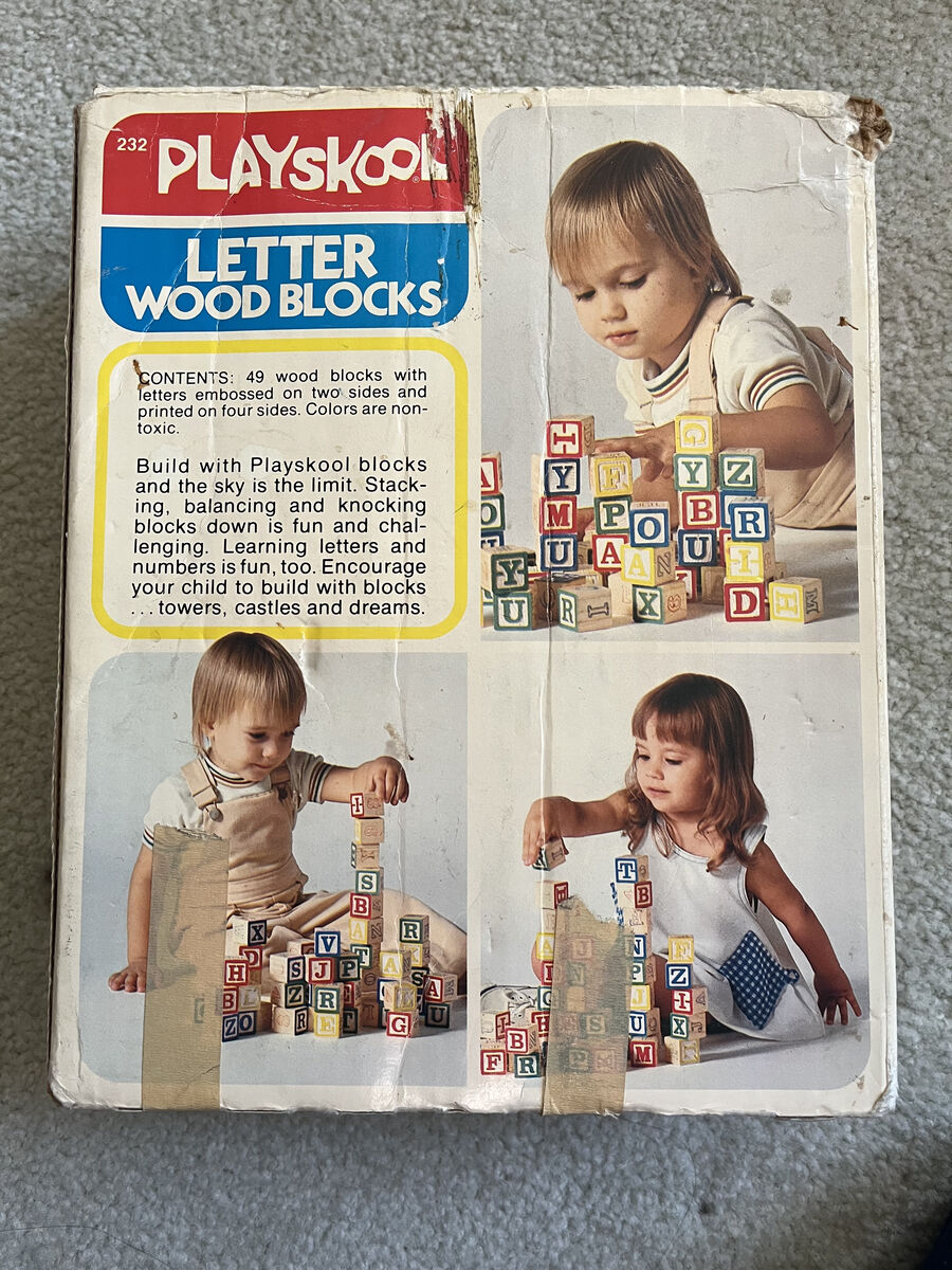 Vintage wooden alphabet blocks by Playskool, c. 1979. 49 pieces. All present and in good condition. Letters are embossed on one side of the cube with other letters stamped/stenciled on the other sides of the cubes. Enough cubes to make simple words as children learn to spell. Great for parents who want to avoid plastic. Also for collectors. Original box, condition as seen here.