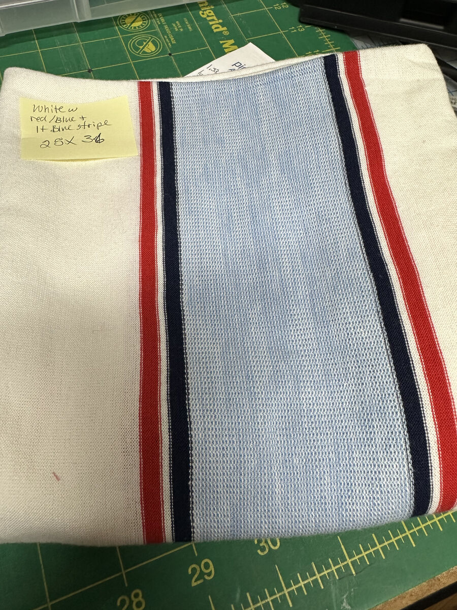 5 - $4 - 5/8 yd x 36" - White w/ Red/Blue Stripe surrounding 3" lt. Blue Stripe.(Shirt front)