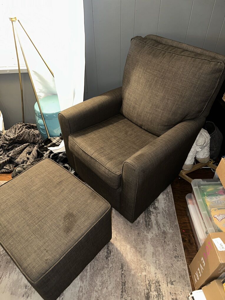 ZelleThis set is in excellent shape. We no longer have room for it. Nothing is broken on it. Great accent chair or great for nursery. $350 new. We’re asking 150. Recently cleaned. Water spots go away.