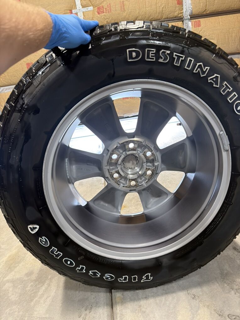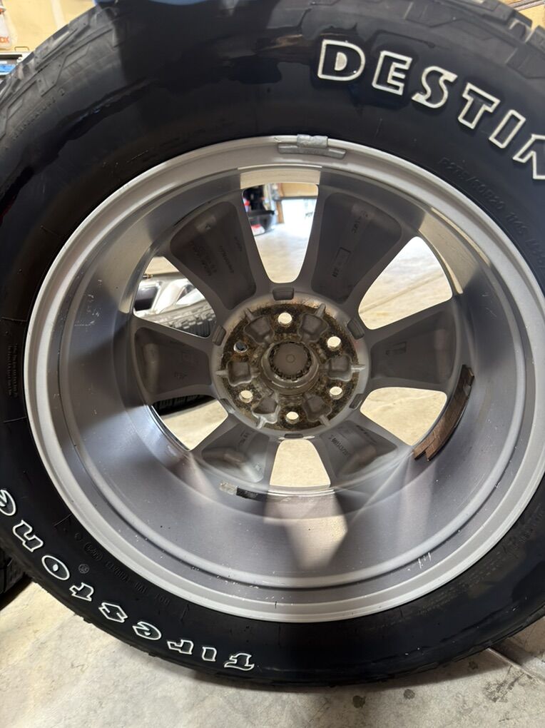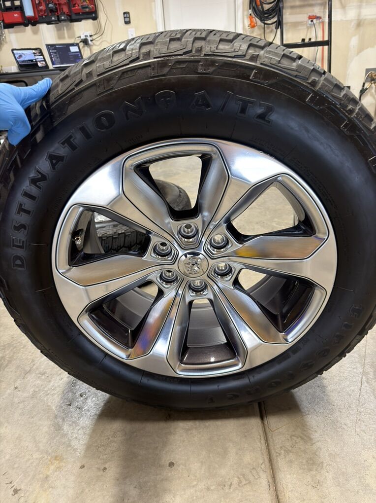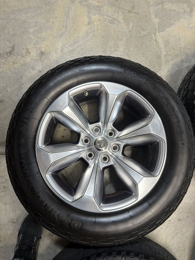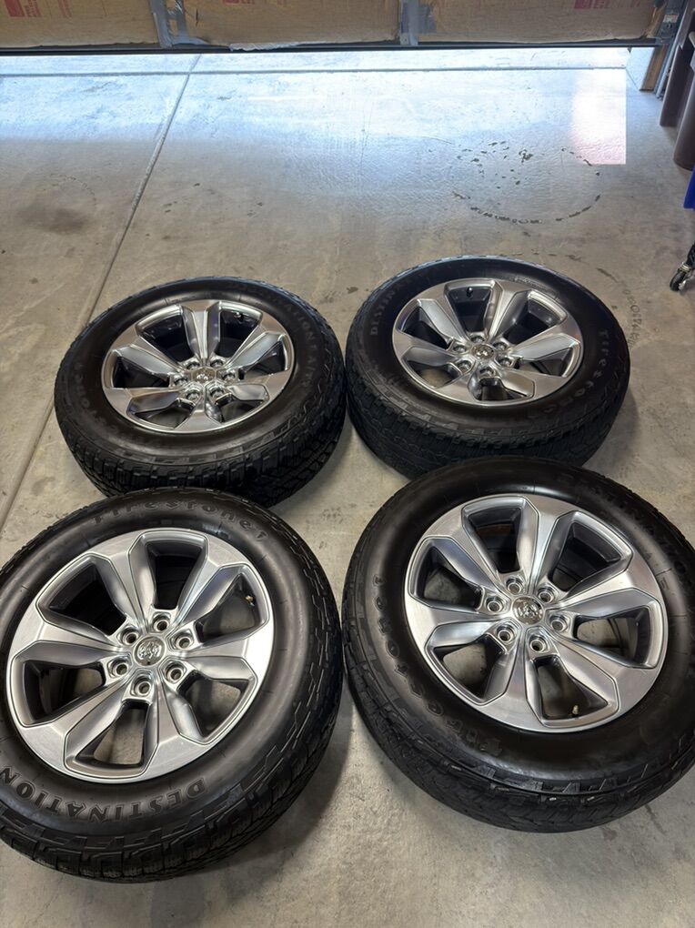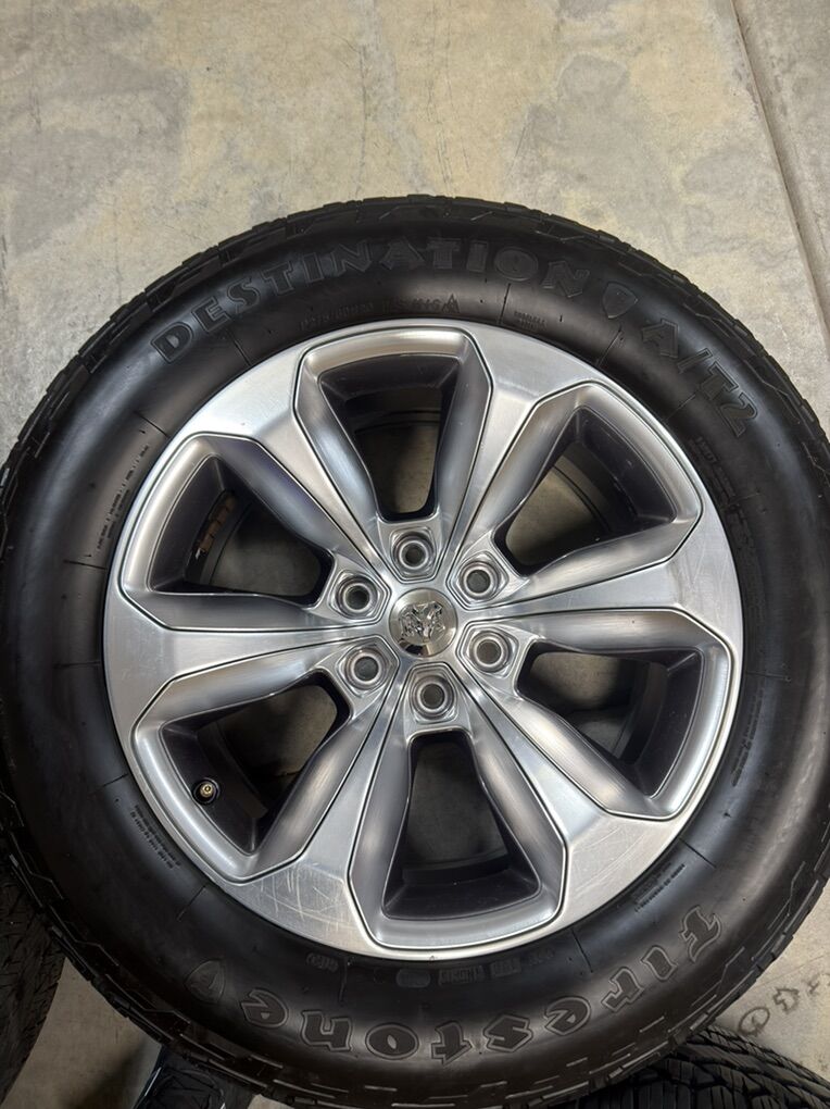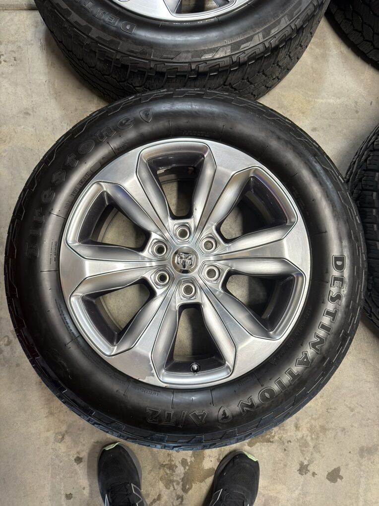 ApplePayStock OEM Rims off a 2020 Ram 1500 Limited Bolt pattern 6x139.7mm or 6x5.5inches Comes with 4 Firestone Destination AT2 mounted and balanced in a 275/60/20 Comes with 24 lug nuts 4 of which are the factory locking lug nuts and 2 keys for locking nuts Thread wear between 5 and 6/32 One tire is at 11/32 ( had a blowout and replaced) See pics for condition of each rim and tire tread wear Can throw in 4 brand new TPMS sensors for an extra 80