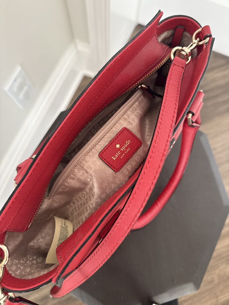 Red Kate Spade satchel, shoulder strap with gold accents, like new. 10” wide 71/2” height
