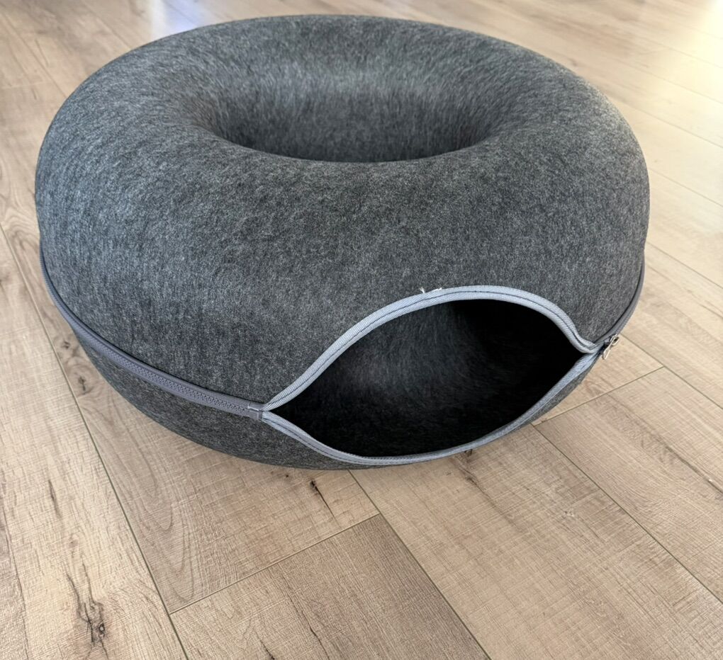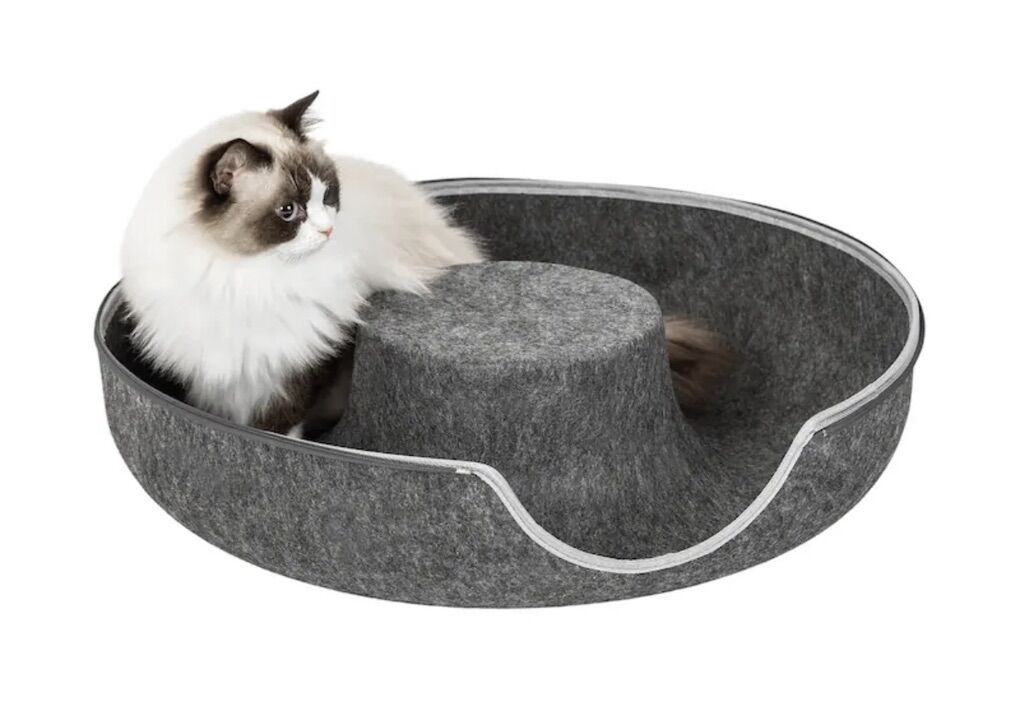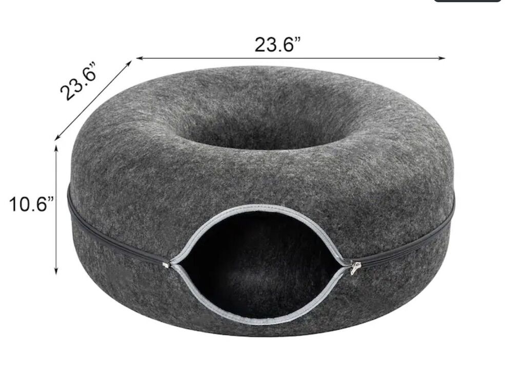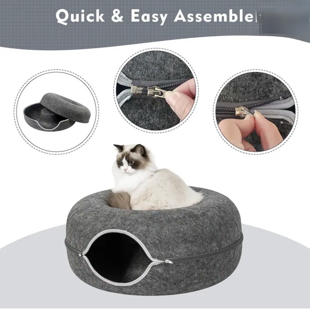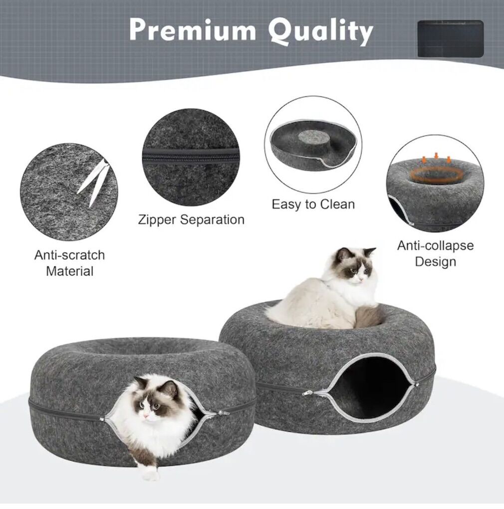 This cat tunnel bed combines a tunnel, resting area, and play zone into one, meeting your cat's needs for exploration, hiding, and lounging. Made from eco-friendly felt fabric with durable zippers, it offers a sturdy yet soft and comfortable structure. The detachable design makes cleaning easy, while its lightweight construction allows for effortless mobility. Featuring a modern, minimalist design, it seamlessly blends into any home décor
