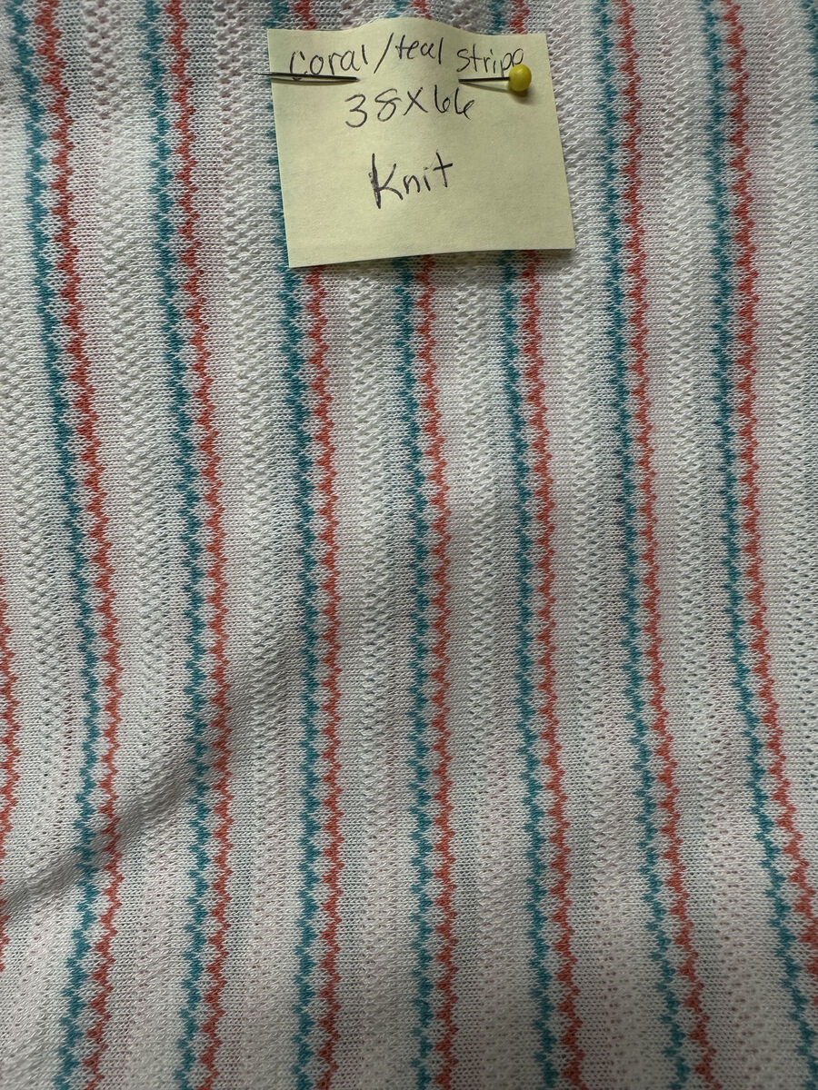 19 - $8 - 1 yd x 66" - White w/Coral, Teal Woven stripes