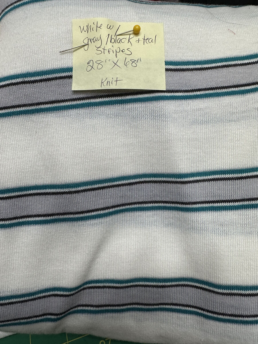 18 - $6 - 3/4 yd x 68" - White w/1/2" Gray stripe boardered by Black & Teal stripe