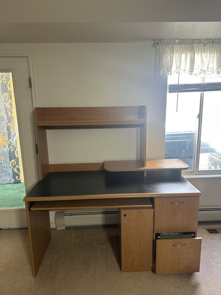 ApplePaySturdy, well-built computer desk with matching hutch and plenty of storage. Features a pull-out keyboard tray, upper shelving for monitor/books/decor, and side cabinet with drawers—great for a home office, student desk, or workspace.