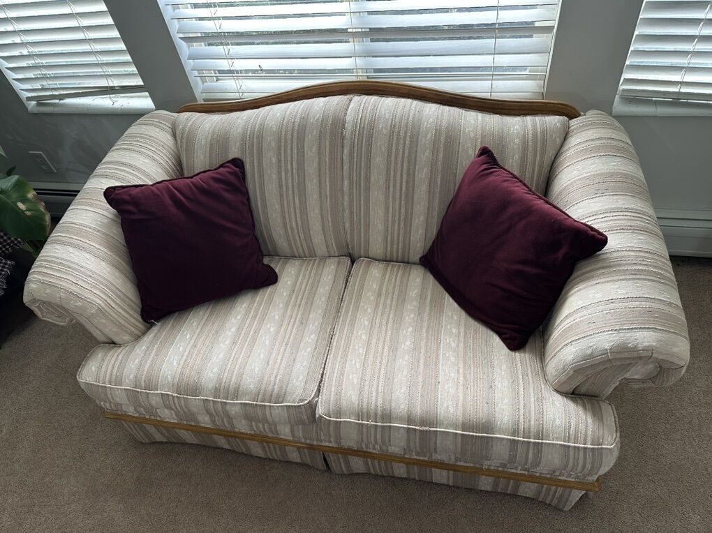 ApplePayBeautiful matching sofa and loveseat set in a neutral cream/tan striped fabric with wood trim accents. Clean, comfortable, and well cared for—perfect for a living room, sitting room, or office space.
