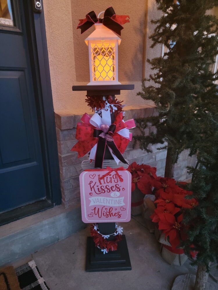 What's included: • Solid wood post construction with exterior black/white painted finish • Cast iron decorative hook (Vintage Style) • Holiday/Seasonal Sign or Wreath • Lighted Lantern Topper/Fixture- Batteries Included • Decorative bows and garland (Bows may be different than pictured) • Ready to display right now