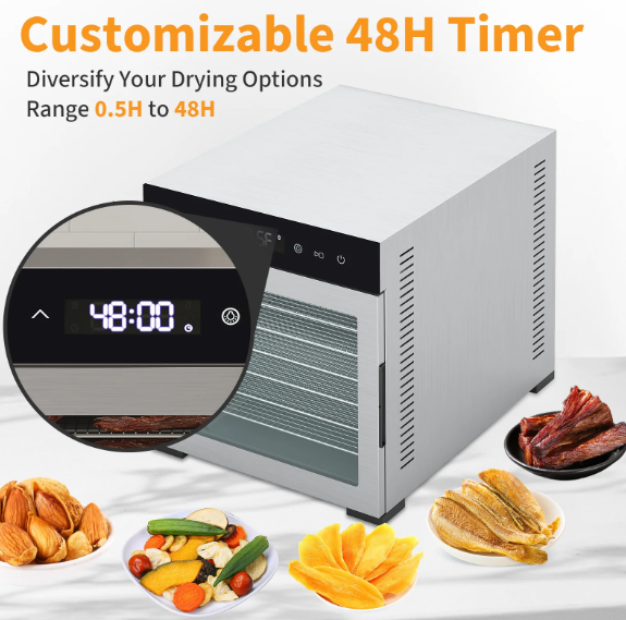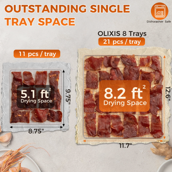 Zelle8-Tray CapacityMeet your family's homemade snack demands with our superior 8.2 sq ft drying space. Featuring 8 full-size stainless steel trays, our dehydrator offers significantly more capacity than standard 6-tray models, allowing you to dry larger batches of jerky, fruits, herbs, and more in one go.