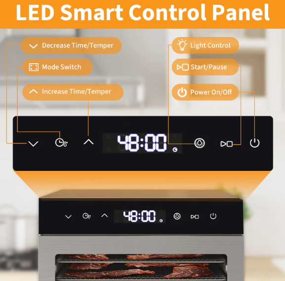 Precision Digital ControlsAchieve professional-quality results with ease. The digital control panel lets you set the timer up to 48 hours and precisely dial in any temperature between 85°F and 185°F. This wide, accurate range gives you complete control to perfectly dry everything from delicate herbs to hearty jerky.