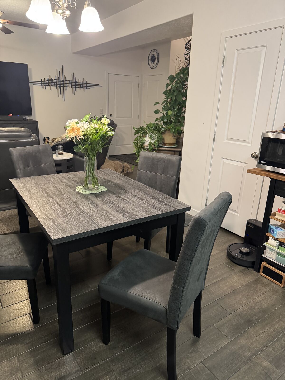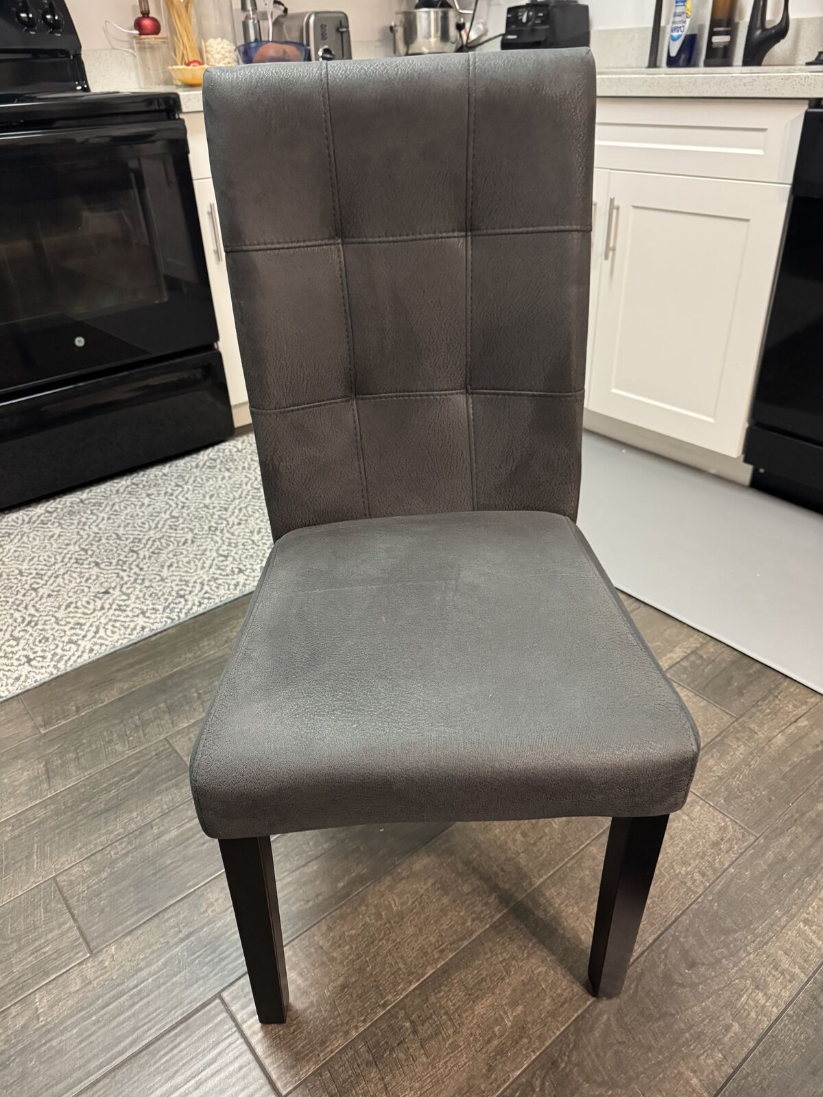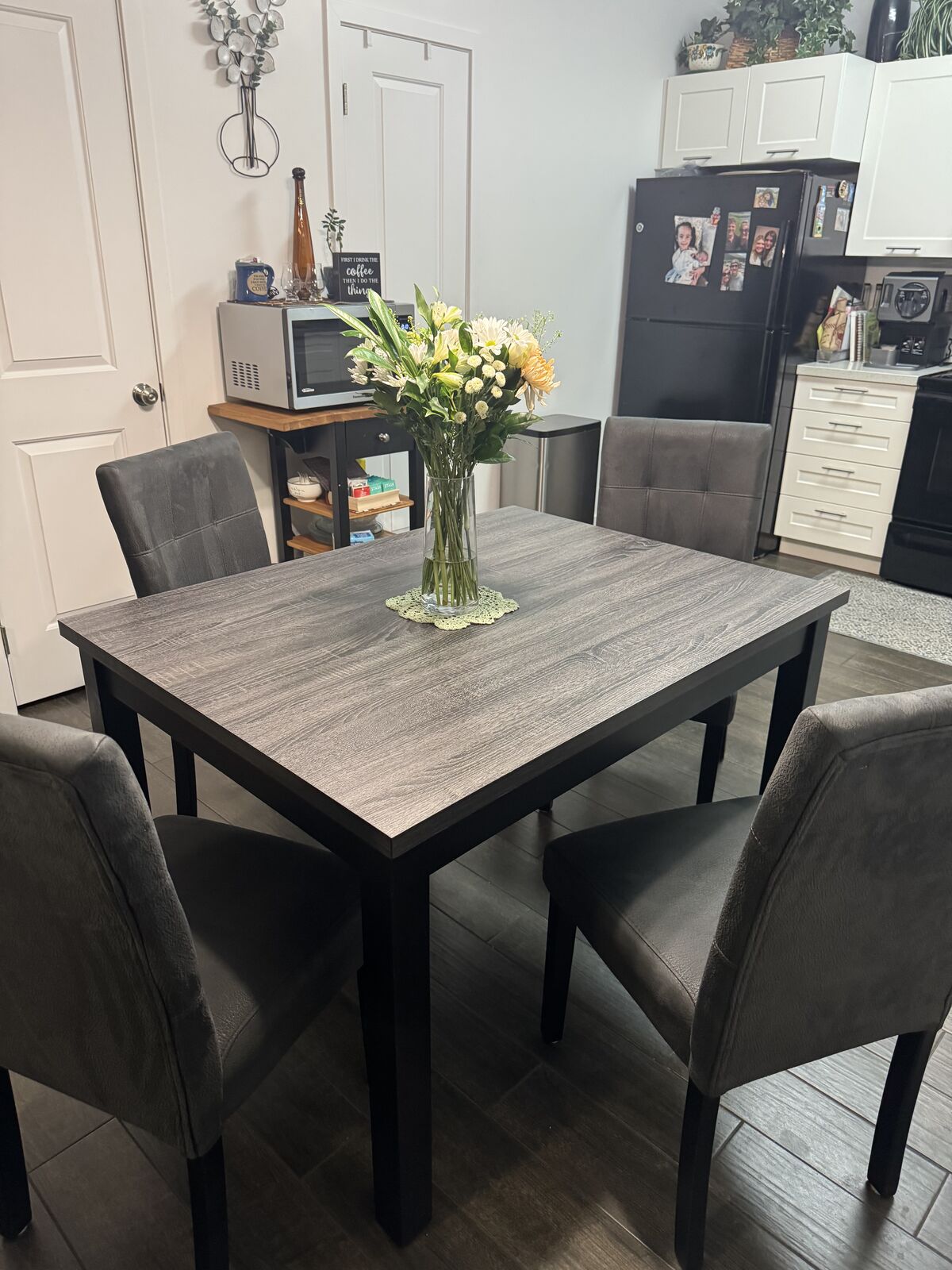 VenmoBeautiful dark gray dining set all wood table microfiber upholstered chairs. Excellent condition. Table is 47.5" x 36". Fits in smaller areas.