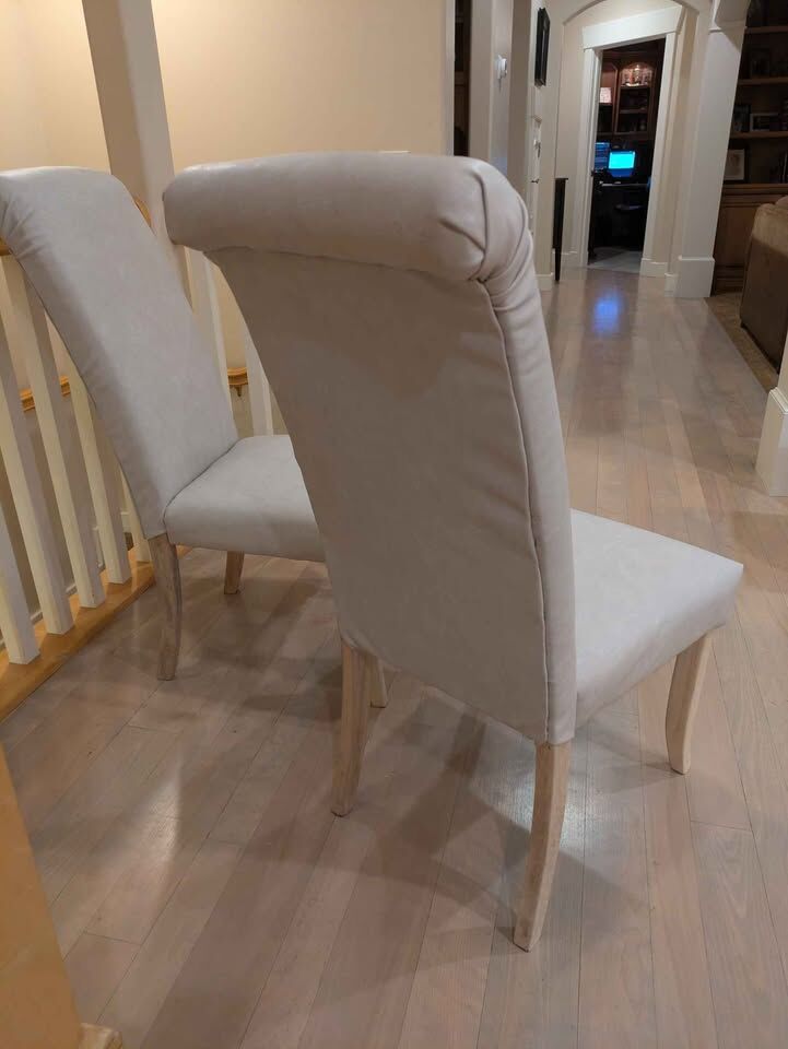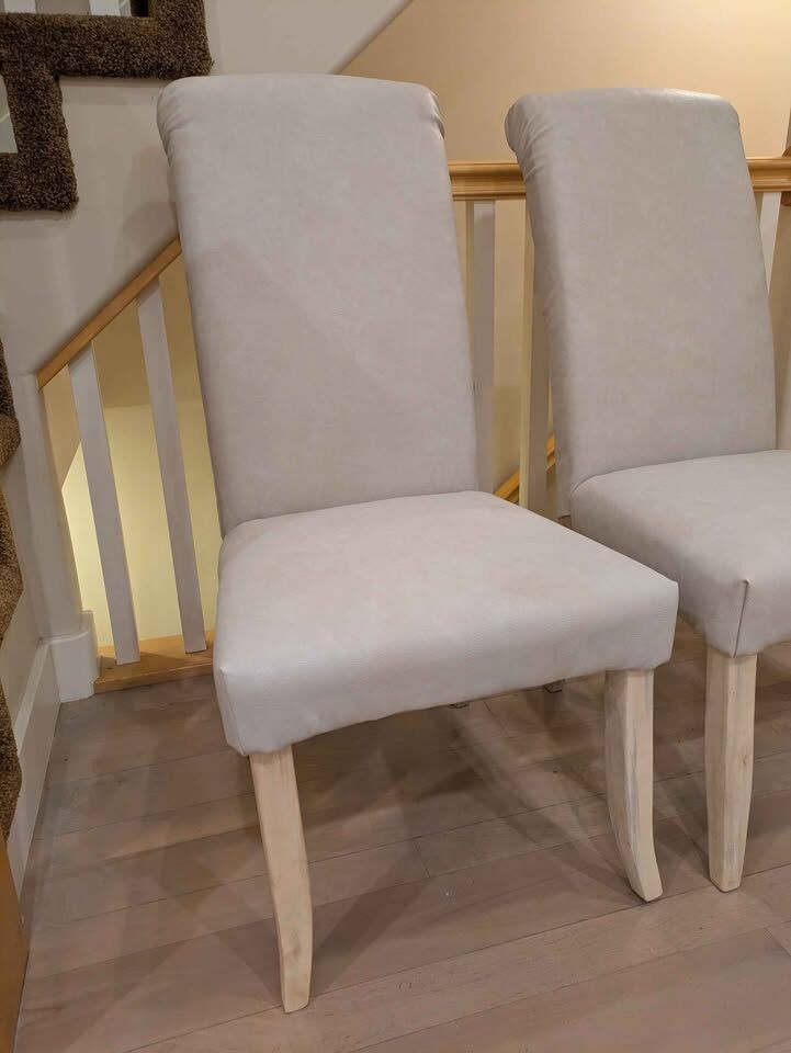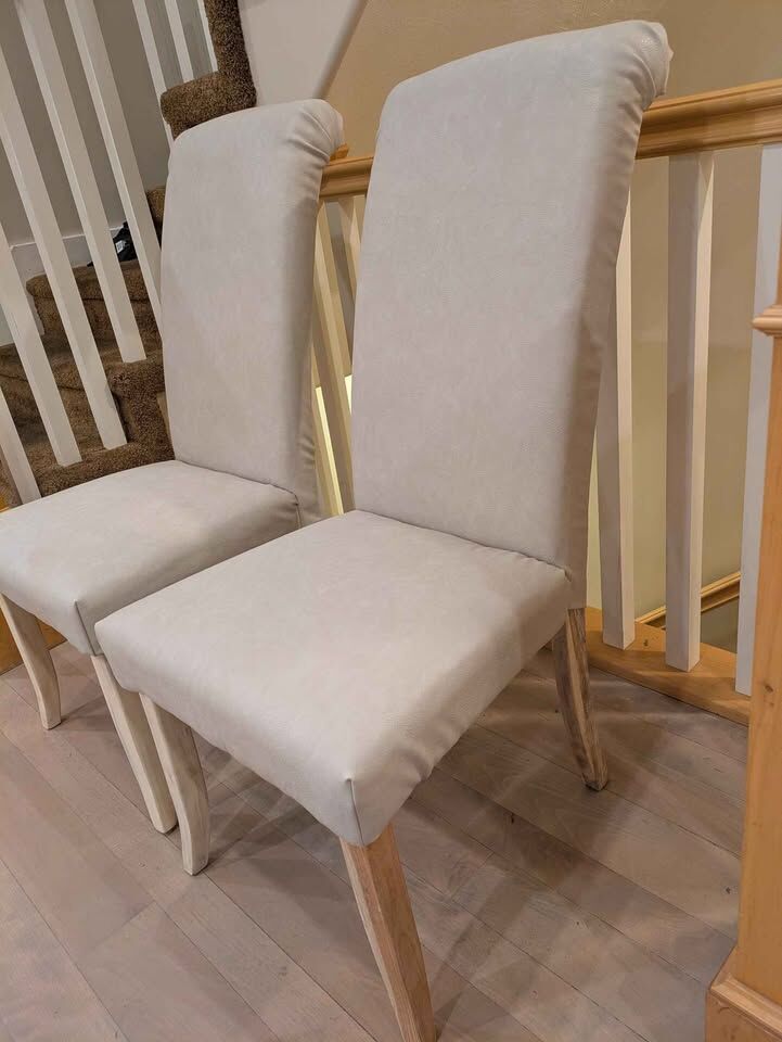 PayPalThese two beautiful chairs have been completely reupholstered in a cream, off-white faux leather. The high backs give them a unique and distinctive look. Great for multiple uses and rooms.