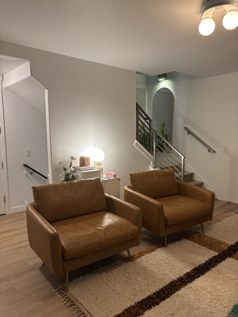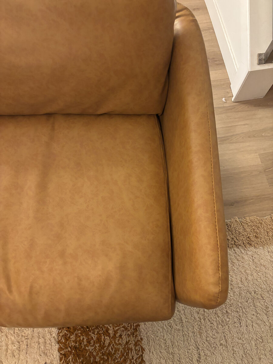 Like new, vegan leather sofa chairs. Can be joined together or used separately. Removable arms.