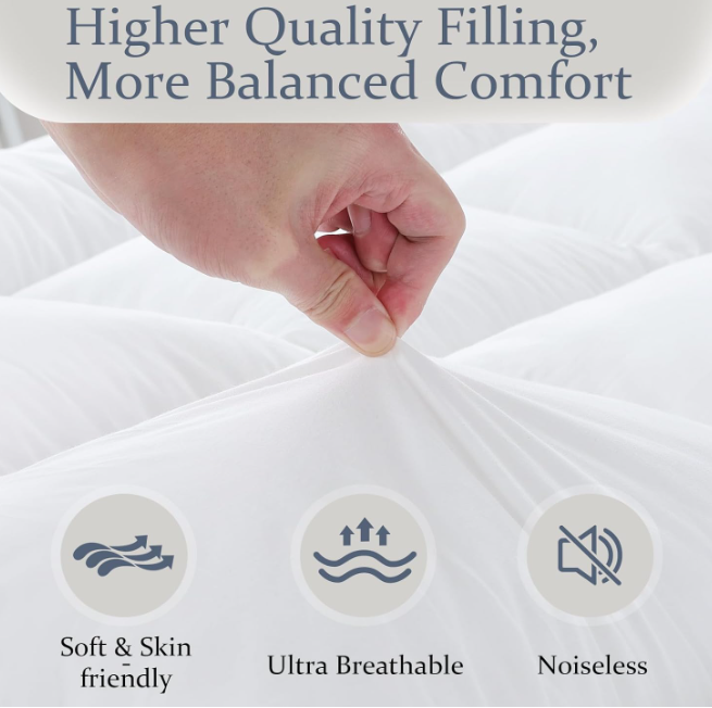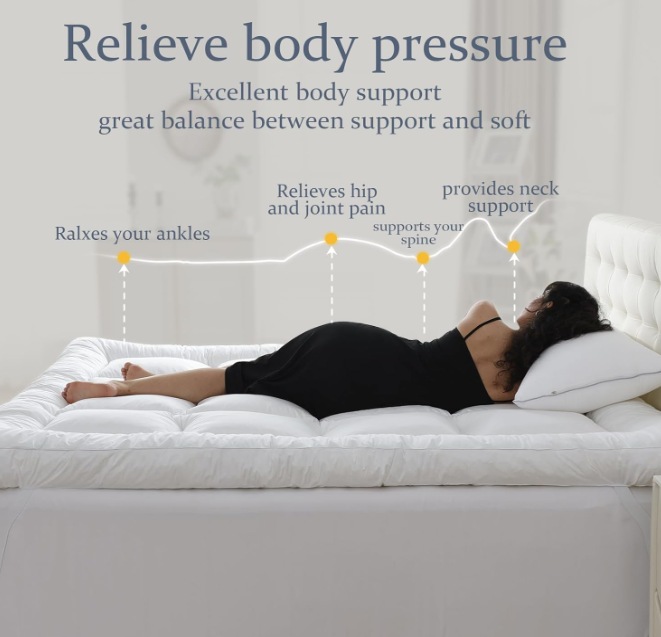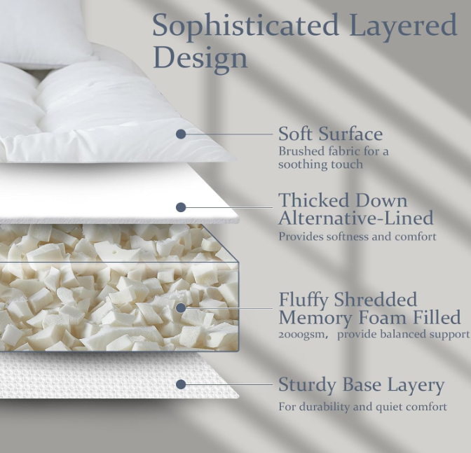Good support, fluffy and soft Soft breathable mattress cover, filled with 2000GSM fluffy shredded memory foam, thickened down alternative lining, provides optimal support, enhanced pressure relief and breathable surface for comfortable sleep.
